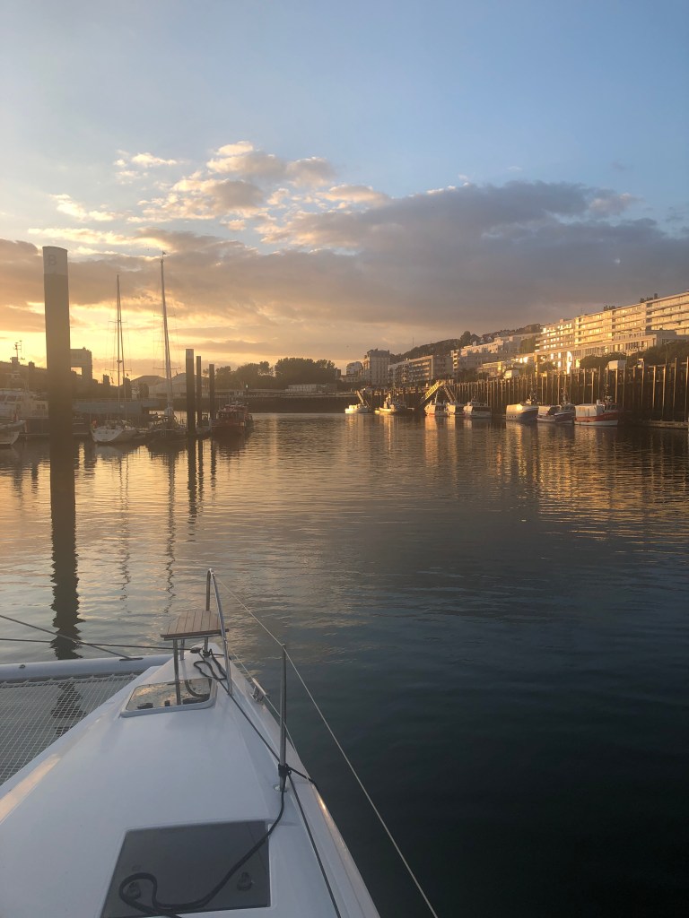 26.06…, weiter nach Plurgrescant. Es schüttete wie aus Eimern, es war kalt und feucht. Die Sicht lag unter 100 Meter. Gut dass es nur 38 Seemeilen bis nach Plurgrescant waren. Dort habe ich mich in die Flussmündung rein geschlängelt und den Anker in ruhigem, aber tiefem Wasser versenkt. Auch diese Nacht war sehr angenehm aber ich war unruhig. Ich wusste, dass sich das Wetter noch weiter verschlechtern würde, und ich wusste dass England die Insel Guernsey wegen Covid für alle Yachten dicht gemacht hat. Nich mal ankern war erlaubt. Ich war hin und her gerissen. Auf der einen Seite solle sich das Wetter drastisch verschlechtern, und ich wäre ein paar Tage in der Flussmündung gefangen. Damit wollte ich mich nicht anfreunden. Auf der anderen Seite konnte ich Guernsey nicht anlaufen, was mich zu einer Etappe von über 100 Seemeilen zwingen würde.  Ich wägte ab, telefonierte mit Raymonde und entschloss mich um 9.00 dazu mich auf den Weg nach Cherbourg zu machen. Es regnete immer wieder Bindfäden, und die Sicht verringerte sich in den Schauern drastisch. Mein Plan war es erstmal nach Norden zu kommen, und dann die Inseln im grossen Bogen zu umfahren. Ich kann es leider nicht so schildern wie es wirklich war, aber es war die für mich grösste Herausforderung, die ich auf einem Boot hatte. Der Wind nahm immer mehr an Stärke zu und die Wellen wurden höher und höher. Ich schätze mal 5 Meter hatten die bestimmt. Was am Anfang lustig war, nämlich die Wellen hinab zu surfen, wurde bald zur Qual. Im Wellental wurde ADESSO immer heftig ausgebremst, und das Vordeck war mehr als einmal unter einer Wasserfontaine verschwunden. Erschwehrend ist dazu gekommen, dass die Wind und Wellenrichtung nicht mit der Vorhersage übereinstimmte. So stampfte ich nach kurzer Zeit gegen die Elemente. Eine andere Yacht, welche mit mit ungefähr zeitgleich gestartet war, hatte schon umgedreht und fuhr zurück in den Fluss (konnte ich auf dem AIS verfolgen). Es krachte, schüttelte und stampfte in allen Ecken. Irgendwann drehte der Wind so ungünstig, dass ich nicht mehr segeln konnte und die Motoren anschmeissen musste. Normalerweise fährt man bei einem Katamaran mit nur einem Motor, aber es fehlte an Leistung und nur mithilfe beider Maschinen sollte ich langsam weiter kommen. Als ich das Vorsegel einrollen wollte verfing sich zu allem Überfluss auch noch eine Leine in der Rolle. Am Boot gesichert kroch ich also nach vorne. Schlagende Segel, klemmende Leine, Regen, kalt, ADESSO schlug immer wieder so heftig in die Wellen, dass der gesamte Bug mit Wasser geflutet war… und ich sass vorne auf den Knien im Netz, pitschnass, um mit klammen Fingern zu versuchen, das Seil wieder gängig zu machen… kein Spass kann ich euch sagen. Es gelang mir dann aber irgendwann, und ich konnte das Segel wieder ganz einrollen. Doch es war keine Zeit zum verschnaufen. Die See wurde immer heftiger, und die Dämmerung brach schon ein. Schnell bereitete ich alles für die Nacht vor. Eine Nacht die ich so schnell nicht vergessen werde. Es ist gespenstisch, in stockdunkler Finsternis nicht zu wissen, wann die nächste Welle einschlagen wird. Du bist dauernd voll angespannt, musst dich dauernd festhalten. Ich hoffte, dass ich hinter Barfleur etwas mehr Schutz hätte. Doch weit gefehlt…, ununterbrochen ging es so weiter bis ich um 2:00 nachts in Cherbourg einlief. Ich machte mich einfach irgendwo fest. Es war mir komplett egal, nur fest. Ich war bis auf die Haut durchnässt, und so voll mit Adrenalin, dass ich erst Stunden später zur Ruhe gekommen bin. Es ist nicht möglich es so wieder zu geben wie es wirklich war. Aber glaubt mir, ich muss es nicht nochmal haben.