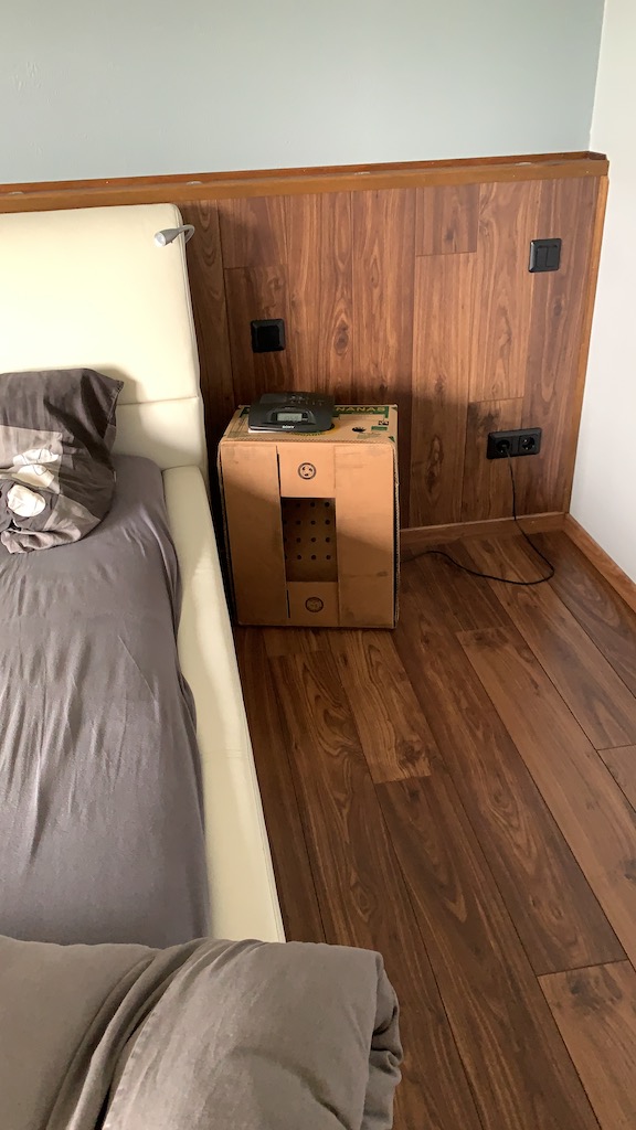 Der Schlafzimmerschrank und die Nachttische sind schon verkauft, daher muss eine Bananenkiste als Nachttisch herhalten…