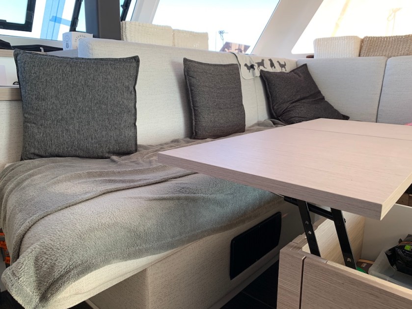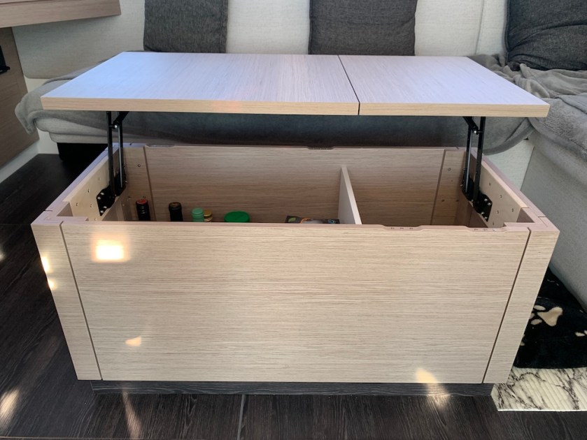 Auf ADESSO wird es jedoch zunehmend gemütlicher. Guy hat unseren Salontisch umgebaut und mit zwei Lift-Up Möbelscharnieren versehen, so dass wir die Tischplatte jetzt näher an uns heranziehen können zb. zum Essen oder zur Computerarbeit. Ausserdem kann er jetzt während des Kochens als zusätzliche Ablage genutzt werden und man kommt gleichzeitig ohne Probleme an die Nahrungsmittel die im Inneren des Tisches verstaut sind.