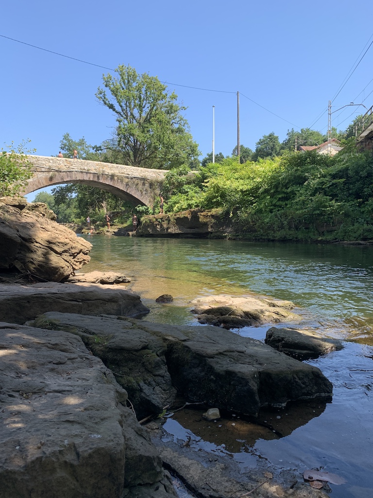 Nach gut 500km bin ich dann an meiner zweiten Etappe in Valles nahe Reocin angekommen. Auf dieser Etappe kam ich auch ohne Schwierigkeiten voran und erfreute mich unterwegs immer wieder an der schönen Landschaft zwischen Biarritz und Bilbao, eine Mischung aus Österreich und der Bretagne. Auf der einen Seite hohe Berge, auf der anderen Seite wilde Felsküste. Ich war wirklich gut vorangekommen, aber kurz vor dem Ziel stand ich vor dem Problem, dass das Hotel sich leider nicht da befand wo mein Navi es mir anzeigte. Ich irrte ziemlich lange in den schmalen Gassen umher und entschloss mich dann im Hotel anzurufen, was mir aber auch nicht wirklich weiterhalf, denn die Dame am Telefon sprach leider nur Spanisch. Ich bin zwar seit ein paar Monaten dabei mir ein bischen spanisch Kenntnisse anzueignen, aber hier stellte ich schnell fest, dass ich noch nichts verstehe. Schlussendlich fand ich heraus, dass es ein gleichnamiges Hotel etwas weiter an der Hauptstrasse gibt und so versuchte ich mein Glück dort. Hier war ich dann richtig und man teilte mir mit, dass das Hotel früher unten im Dorf gestanden hat, später dann aber neu an dieser Hauptstrasse errichtet wurde…Aber ich war angekommen, das war das Wichtigste. Ich brachte meine Sachen aufs Zimmer, und dazu gehört übrigens auch mein kleiner Ibiskus, ein Setzling von meinem schönen Ibiskus den ich in Luxemburg zurücklassen musste. Eine Pflanze hatte ich mit Guy ausgehandelt ;-), dürfte mit auf Adesso… So nahm ich jeden Tag meinen kleinen Ibiskus mit ins Zimmer, weil er in der Hitze im Auto wahrscheinlich eingegangen wäre. Natürlich brachte mir das fragenden Blicke ein und so wurde ich dann auch jedes Mal von den Mitarbeitern gefragt, warum ich eine Pflanze dabei hätte. Sie waren dann immer ganz interessiert, wenn ich erklärte, dass ich unterwegs zu meinem Mann sei der mit unserem Boot auf mich (und Chico) in A Coruña warten würde…Da ich noch ein paar Stunden Zeit hatte bis zum Abendessen, welches ja hier in Spanien erst ab 20.30Uhr serviert wird, entschloss ich mich mit Chico einen Spaziergang zum Rio Saja zu machen. Hier vergnügten sich die Jugendlichen aus der Umgebung. Sie machten Kunststücke von der Brücke in den Fluss, nahmen ein Bad, sonnten sich. Auch ich verweilte hier eine ganze Weile. Hier ein paar Eindrücke: