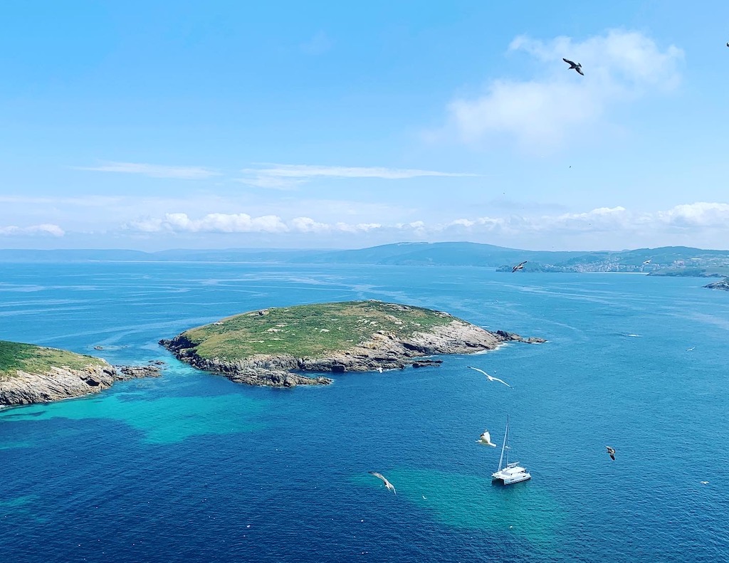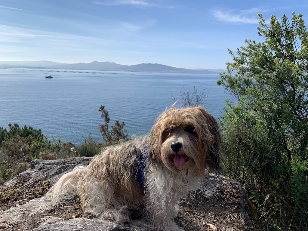 Unser erster Törn führte uns zu den Sisarga Inseln, zwei kleine unbewohnte (zumindest von Menschen unbewohnt, denn hier leben hunderte Möwen) und naturbelassene Inseln. Hier fiel unser Anker vor der Sisarga Grande auf einem kleinen Sandfleck. Auf maps.me hatte ich einen kleinen Wanderweg bis hoch zum Leuchtturm entdeckt. Leider mussten wir feststellen, dass der Weg total zugewuchert und nur noch zu erahnen war. So musste ich Chico immer wieder tragen, da er nicht durch das dicke Gestrüpp durchkam. Aber die Aussicht war wirklich grandios und die Mühe wert.