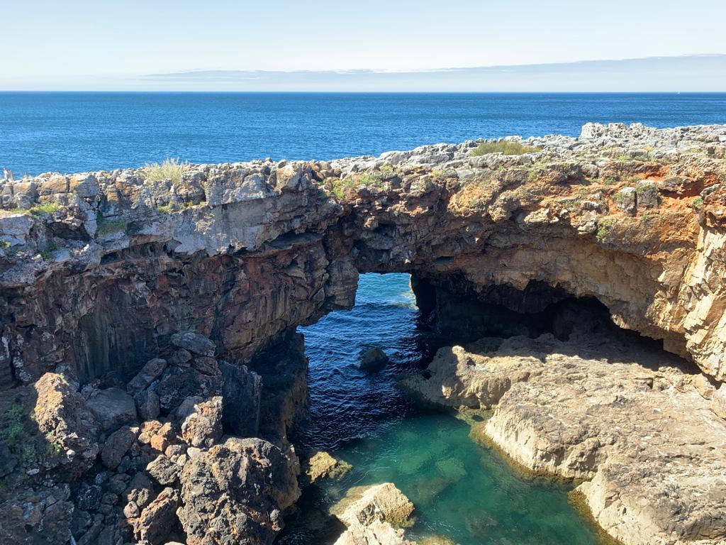 Heute morgen sind wir bis zum Boca do Inferno spaziert, eine bekannte Felsformation mit einer bogenförmigen Öffnung durch die bei rauer See die Wellen hochpeitschen.