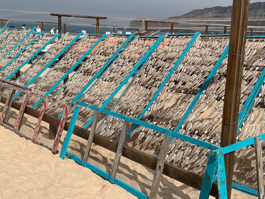 An einem Strandabschnitt werden die Fische noch wie früher an der Luft und unter der Sonne getrocknet und dann an der Strandpromenade verkauft. Bei uns beiden sollte aber kein Hungergefühl aufkommen bei dem Anblick und dem unverkennbaren Geruch…