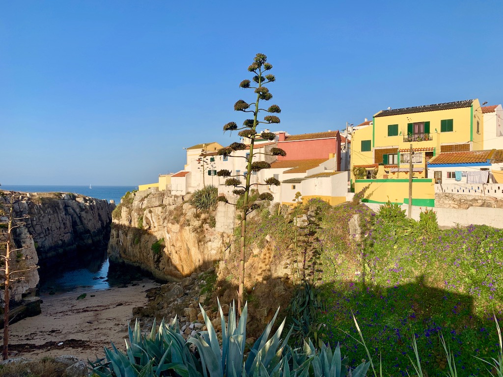 Sie waren immer mit einem kleinen gelben Fischsymbol gekennzeichnet. Auf unserem Rückweg zum Hafen haben wir dann den schönsten Teil von Peniché entdeckt, den Miradouro do Carreiro de São Marcos: kleine Gassen mit alten Häusern mit farbigen Fassaden die entlang der Felsklippe einer kleinen Bucht gebaut waren.