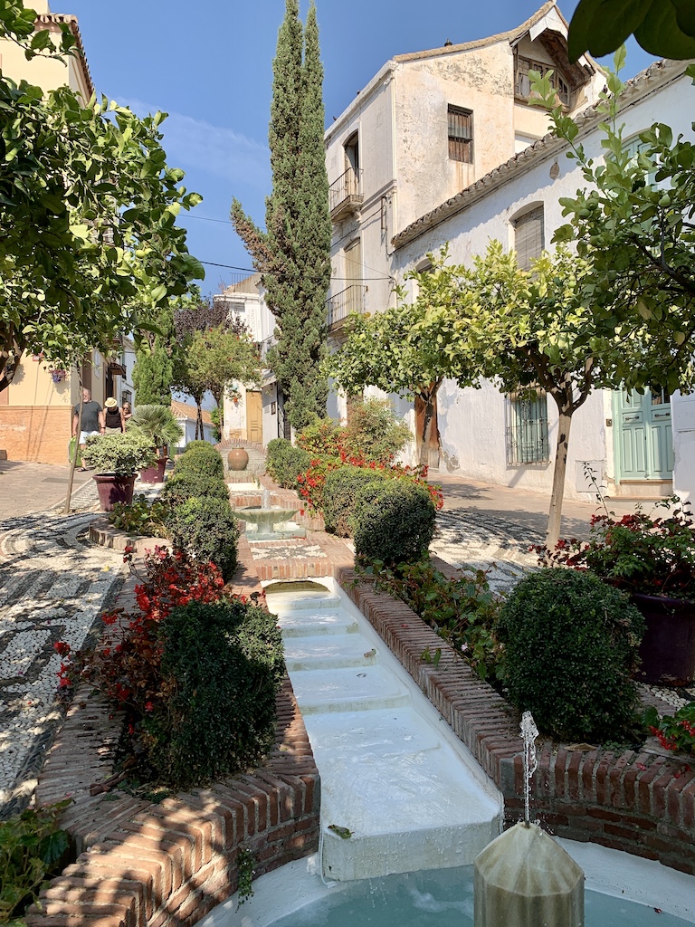 In Estepona angekommen wurden wir nett von einem Marineiro am Meldesteg empfangen, mussten dann aber bischen Geduld haben, bevor wir zu unserem Liegeplatz durften, denn das Hafenbüro war für zwei Stunden Mittagspause geschlossen. Die freundliche Dame entschuldigte sich anschliessend ausgiebig für die Wartezeit und erklärte mir, dass sie heute alleine sei und daher das Hafenbüro zum Mittagessen schliessen musste. Zur Begrüssung oder vielleicht auch als Entschuldigung, überreichte sie mir eine Flasche Weisswein…eine nette Geste. Der Hafen von Estepona ist der älteste der spanischen Mittelmeerküste, aber alles war sehr gepflegt und sauber. Jetzt mussten wir nach langer Zeit auch wieder mit Moringleine festmachen. Schluss mit den Schwimmstegen hier im Mittelmeer. Aber es hat alles ohne Probleme geklappt (ausser dass wir uns das Boot mit der ekeligen Moringleine bespritzt haben). Die Altstadt von Estepona hat uns sehr gut gefallen. Hier wird sehr viel Wert auf eine angenehme Athmosphere gelegt. Überall findet man Pflanzen, viele Kunstwerke, kleine Springbrunnen, schöne Mosaikpflaster… Alles ist gepflegt und sauber. Die Strandpromenade war auch sehr schön gestaltet. Zwischen Strasse und Strand hatte man einen schmalen Streifen mit vielen verschiedenen Pflanzen angelegt: Palmen, Bananenstauden, Kakteen, viele Sträucher mit farbigen Blumen… da lacht das Herz… eine sehr schöne Stadt in der wir uns wohlfühlten.