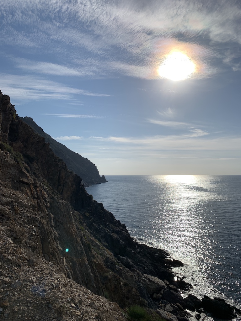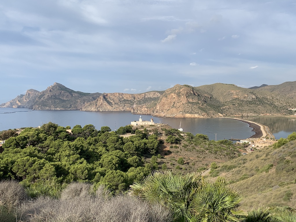 Unsere Ankerbucht, die wir ab der Marina Garuccha angesteuert haben, war die Bucht von Calabrina weiter nördlich Richtung Cartagena. Die Umgebung gefiel uns sehr gut. Die Bucht war eingebettet in eine Landschaft aus dunkelen Felsen, unterbrochen durch grüne, sehr saftig schimmernde Täler. Anfangs dachten wir, es wären Golfplätze, aber als wir näher kamen, konnten wir erkennen, dass es Felder waren.