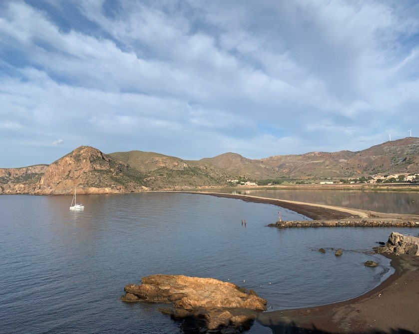 Aber zurück zur Bucht von Portman. Wir ankerten vor einem langen schwarzen Strand, dessen Sand so fein wie Puder war (und sich dementsprechend auch sehr gut im Fell von Chico ansammelte). Hinter dem Strand lag ein grosses Feuchtgebiet in dem sich Flamingos und andere Seevögel aufhielten. Weiter im Hinterland lag die Ortschaft Portman und eine alte stillgelegte Fabrik. Dann gab es noch einen natürlichen Mini-Fischerhafen mit Holzstegen der Marke „Eigenbau“, zwei einheimische Restaurants die den frisch gefangenen Fisch vom Tag in verschiedenen Variationen anboten. Wir haben uns aber entschieden auf Adesso zu kochen, denn wir wären ziemlich sicher nicht im trockenen Zustand am Strand angekommen. Die Brandung war einfach zu stark um mit dem Beiboot sicher an Land und wieder zurück zu kommen. Zudem schien die Qualität des Wasser hier nicht die Beste zu sein, denn es schwamm so eine weisse Schicht auf der Oberfläche und das Wasser roch nach Aquariumwasser, das dringend ersetzt werden müsste. Wir gehen davon aus, dass die vielen Fischzuchtstationen in der Umgebung einfach zu viele Nährstoffe ins Wasser abgeben und dies dann die Folge ist.
