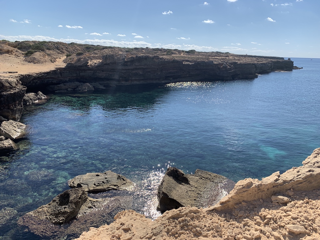 Nachdem wir das SUP hinter dem Gestrüpp „versteckt“ hatten, wanderten wir über den felsigen Küstenweg Richtung Punta de Sa Pedrera. Hier begegneten wir keiner Menschenseele. Nur wir und das Meer und die raue karge Felsenlandschaft, aufgelockert durch ein paar Pinienbäume, ein paar Hecken und blühende Rosmarinsträucher. Je mehr wir uns der Punta näherten, je karger wurde der Bewuchs. Verschiedene Stellen glichen einer Mondlandschaft, nur Sand und Felsen in denen man noch Überreste von versteinerten Muscheln finden konnte. Hier ein paar Eindrücke von der Punta de Sa Pedrera aus:
