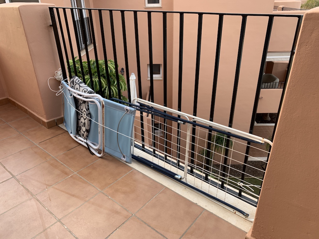 Ein bischen MacGiver-Talent und viel viel Geduld (eine Herausforderung für mich) und Feinmotorik (auch nicht meine Stärke, nennt Guy mich doch immer „Grobmotoriker“) brachten schlussendlich den Erfolg. Da Chico voller Freude mit seinem Ball umherrannte, beschloss ich sofort eine Balkonballrunterfallsperre zu instaliieren…nicht schön, aber müsste seinen Zweck erfüllen 🙂