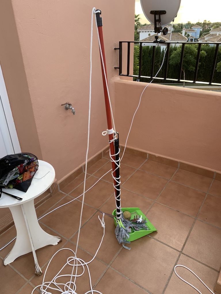 Da die Schaufel alleine zu leicht war und zu unstabil, beschloss ich den Wischmop mit Stange an die Schaufel zu binden. Jetzt hatte das Ganze an Steifheit gewonnen und konnte besser von oben mit dem Seil dirigiert werden. So schafft ich es, nach gefühlten, keine Ahnung, 20 Minuten, die Schaufel unter den Ball zu bringen. Doch es gab noch einen Hacken. Der Ball lag zwar jetzt vorne auf der Kante der Schaufel, aber würde ich die jetzt aufheben, dann würde er sofort wieder runterrollen. Also musste ich den Ball weiter nach hinten, hinter die etwas erhöhte Kante, befördern. Das sollte mir dann irgendwie, nach einer gefühlten Ewigkeit, mit dem Spagettislöffel gelingen. So…, jetzt nur noch hochheben. Mir floss der Schweiss den Rücken runter, kein Witz, denn ich wollte jetzt nicht scheitern und endlich diesen Ball bergen. Ganz behutsam zog ich die Schaufel mit dem daraufliegenden Löffel nach oben und, wirklich, es klappte. Ich schaffte es den Ball so bis auf unser Balkon zu heben. Was für ein Gefühl! Ich war wirklich stolz wie Oskar und definitv jetzt ein Held für Chico. Endlich hat er seinen geliebten Smiley-ball wieder. Ich will euch meine „Erfindung“, meine „Konstruktion“ jetzt aber nicht vorenthalten 😉