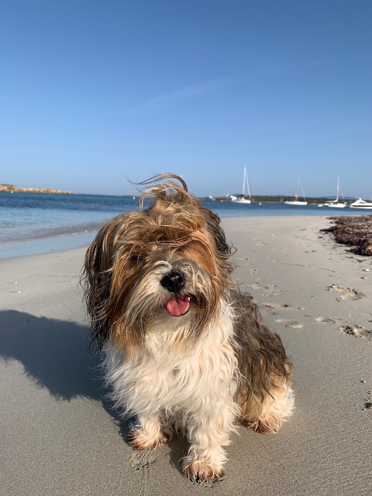 So gegen 22 Uhr gingen wir in die Koje, denn wir wollten noch so lange schlafen, bis der Sturm eintreffen würde. Um 01 Uhr gings dann los. Unmissverständlich war er angekommen. Böen von über 30 Knoten fegten über Adesso hinweg. Es ruckte in den Seilen, Adesso sprang hin und her, die Wellen schlugen gegen den Rumpf, aber der Anker hielt…Uff! Trotz elektronischer Ankerwache wechselten wir uns mit der Ankerwache ab, denn der Wind blas in einem ungünstigeren Winkel in die Bucht hinein als vorausgesagt, so dass wir weit weniger Schutz als erhofft hatten. Sowieso war an Schlaf nicht zu denken, aber derjenige, der „Pause“ hatte, konnte sich wenigstens in die Koje zurückziehen und ein bischen vor sich hin dösen. Ja, solche Nächte sind wirklich nicht schön und da kommt es dann schon mal vor, dass man sich ein ganz normales Bett an Land wünscht. Der kommende Tag wurde leider auch nicht viel besser. Es blieb richtig windig und am Nachmittag zog ein schweres Unwetter über Sant Antoni hinweg. An solchen Tagen heisst es dann: Zähne zusammenbeissen und ausharren. Der Weg zum Strand mit dem SUP hatte es natürlich auch in sich. Eigentlich hatten wir geplant, dass Guy mich mit Chico mit dem Beiboot am Steg absetzen würde, aber daran war nicht zu denken, denn die Wellen schlugen bis über den Steg hinweg. Das hätte unser Beiboot nicht überlebt. Mit dem SUP schaffte ich es ohne runter zu fallen, aber nicht ohne nass zu werden. Chico hatte es einmal so eilig, dass er das angespühlte Seegras wahrscheinlich mit dem Strand verwechselte, und schon 4-5 Meter zu früh vom SUP runtersprang um dann in einer Suppe von Seegras unterzutauchen. Als er am Strand ankam, bekam ich fast einen Schock. Da war kein Fell mehr zu sehen, nur ein Seegrasbüschel!!! Als ich mit ihm nach dem Pippispaziergang wieder auf Adesso ankam, musste er dreimal Duschen und dazwischen immer wieder Kämen über sich ergehen lassen. Auf der einen Seite, tat er mir ein bischen Leid, aber auf der anderen Seite, hätte er einfach mal auf mich hören sollen, als ich ihn ermahnte noch nicht runterzuspringen…grrr.