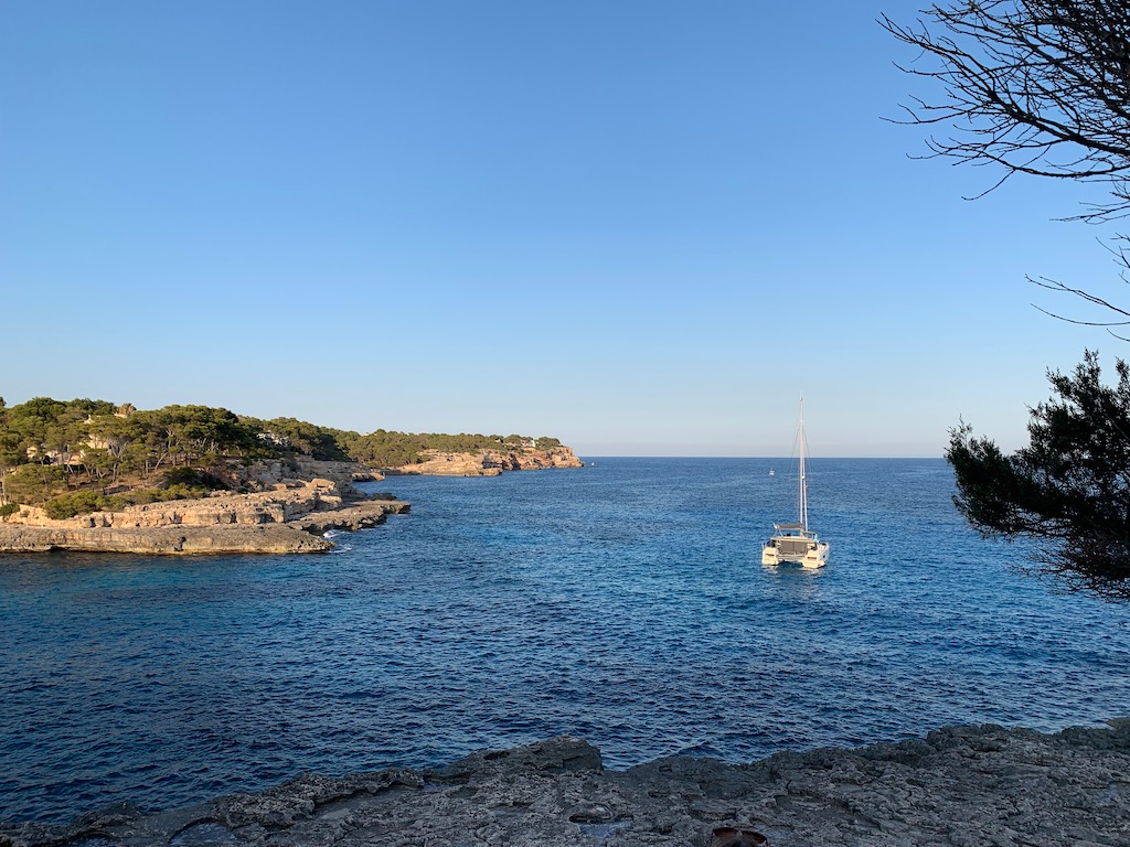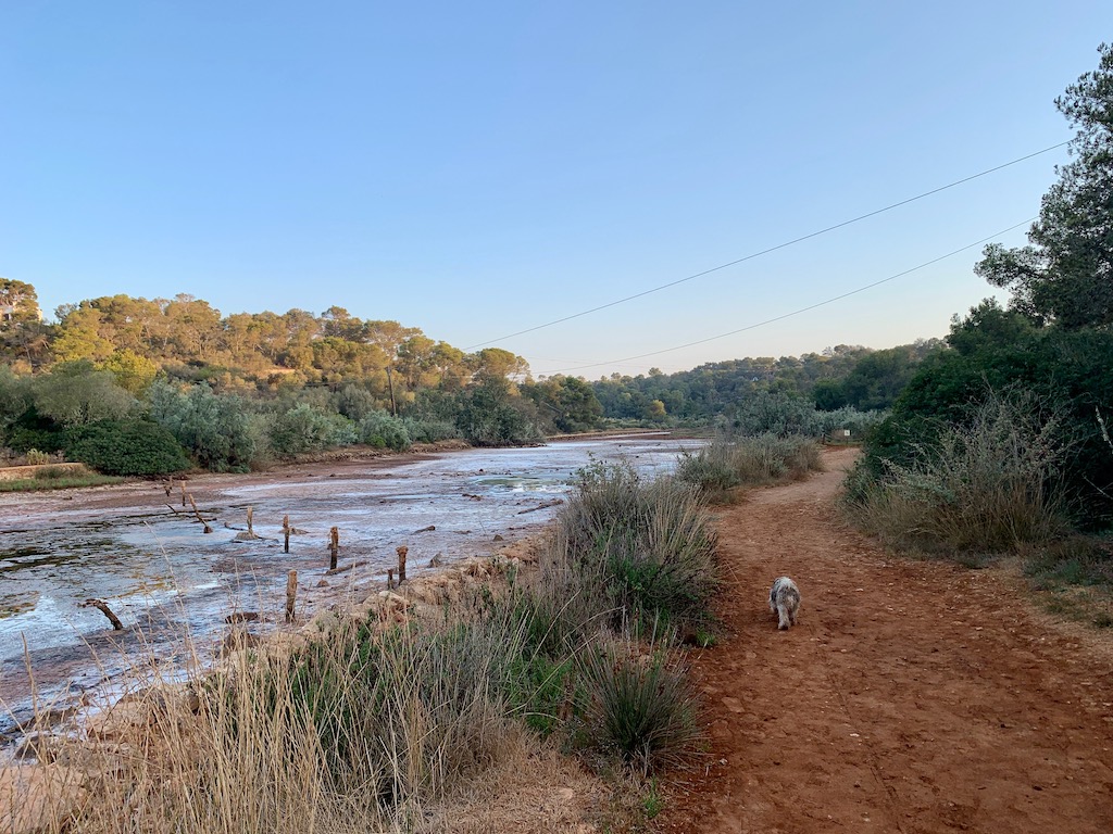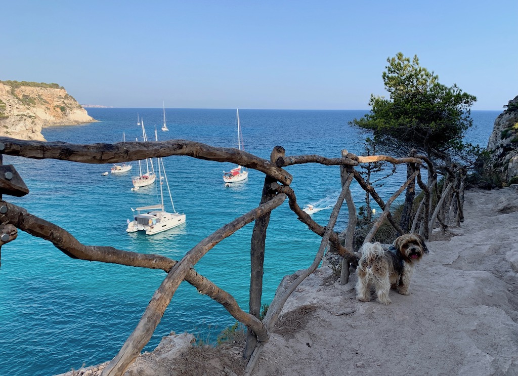 Wir hatten uns entschlossen noch einen Tag länger vor Ses Covetes vor Anker zu bleiben, denn gemeinsam mit den Flamingos wollten wir noch einmal im Bar Esperanza zu abend essen. Am kommenden Tag machten wir uns nach dem Frühstück auf den Weg zur Ostseite, denn unser mittelfristiges Ziel war ja die Überfahrt nach Menorca. Der Anker fiel in der wunderschönen Bucht von Mondragó, die aber leider schon total überfüllt war. Wir entschlossen uns daher etwas weiter draussen vor der Nebenbucht Caló des Borgit zu ankern. Beide Buchten liegen eingebettet in einem Naturschutzgebiet. Hier gibt es zahlreiche Wanderwege durch die Pinienwälder mit tollen Ausblicken auf beide Buchten. Am Morgen, kurz nach Sonnenaufgang machte ich mich mit Chico auf Entdeckungstour.