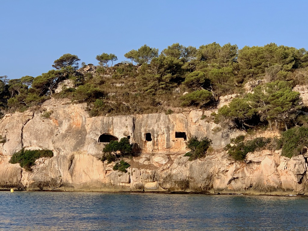 Unsere erste Bucht die wir ansteuerten auf Menorca war die Cala Son Saura. Als wir ankamen, mussten wir wieder etwas weiter draussen bleiben, da schon viele Boote vor Anker lagen, aber am kommenden Morgen, als die ersten wegfuhren, sicherten wir uns einen schönen Platz in „erster Reihe“. Mir hat die Bucht sehr gut gefallen, da sie absolut naturbelassen war und nur von Pinienbüschen/-bäumen und Überresten von alten militärischen Abwehranlagen umringt war.