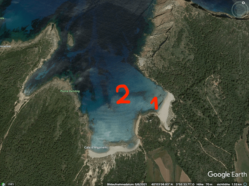 Hier ein Bild der Bucht mit unseren Positionen: auf 1 unser 1. Ankerplatz, auf 2, der zweite.