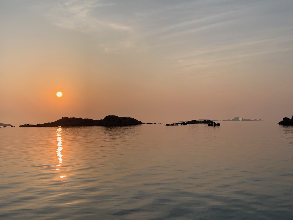 Leider hiess es am nächsten Tag wieder Anker hoch. Ich wäre wirklich gerne noch länger hier geblieben. Vielleicht hätte ich dann auch noch das Haus von Garibaldi einmal besichtigt, was sich hier auf Caprera befindet. Aber leider mussten wir wieder einmal dringend Einkäufe tätigen und unser „Permisso“ war jetzt, nach einer Woche, auch nicht mehr gültig. So fuhren wir morgens nach dem Frühstück noch in eine andere Bucht in der sich ein Supermarkt befand, bevor wir dann weiter zur Westseite von Maddalena segelten um hier in der Bucht Bassa Trinita eine kleine Mittagspause einzulegen. Danach gingen wir hier noch ein bischen mit Chico an der Küste entlang spazieren und machten uns anschliessend auf den Weg in Richtung Capo Testa. Hier fiel der Anker dann am späten Nachmittag in der Bucht Santa Reparata. Hier eine tolle Abendstimmung die ich während des Spaziergangs mit Chico im Bild festhielt.
