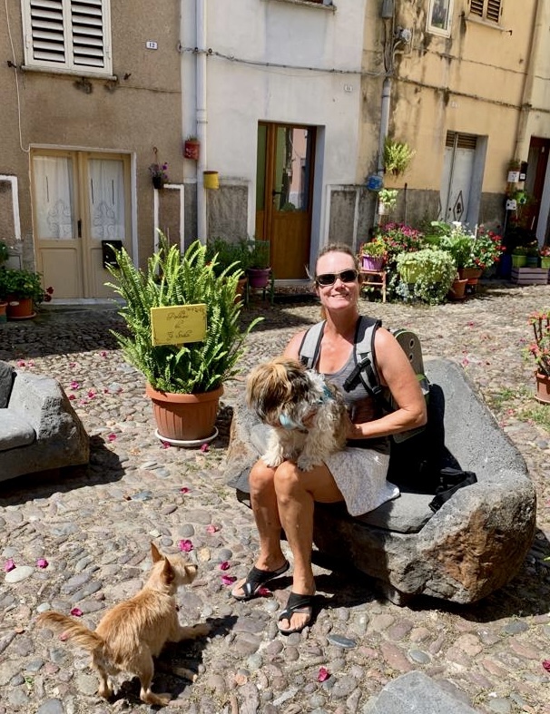 Ab 3 Uhr morgens hatte der Hotel-DJ dann auch genug, oder die Gäste waren inzwischen alle im Bett, auf jeden Fall war es dann sehr angenehm ruhig hier vor Anker. Am Morgen genoss ich es mit Chico entlang des langen Sandstrandes zu spazieren, den wir kurz nach 7 Uhr noch ganz für uns alleine hatten. In der Mittagsstunde, ich war gerade dabei uns eine Kleinigkeit zum Essen vorzubereiten, sahen wir dann ein Motorboot auf uns zukommen und wir ahnten schon, dass dies ein Parkwächter sein könnte, der uns auffordern wird umzuankern. Ja, und genauso war es. Wir dürften hier nicht ankern wegen Naturschutzgebiet und Posidonia (dabei war in diesem Bereich definitiv keine Posidonia, denn ich hatte das morgens überprüft, als ich in der Bucht schnorcheln war.) Aber da es hier keinen Sinn macht zu diskutieren und schon gar nicht auf italienisch, haben wir kurze Zeit später den Anker hochgenommen und sind zu einem Bojenfeld rübergefahren, die laut Parkwächter 24Stunden gratis wären. Ich war froh, als Adesso fest an der Boje hing, denn ich finde dies immer ziemlich kniffelig. Jetzt hingen wir hier, komplett in der Pampa, nur Felsküste und dichtes Gestrüpp an Land. Hier gefiel es uns nicht wirklich. Zudem krachte es ätzend jedes Mal wenn Adesso sich im Wind bewegte und die Seile stramm gezogen wurden. Nachdem ich mit Chico von einer kleinen beschwerlichen Pippirunde an Land zurück war, schlug Guy mir vor, die Bucht zu verlassen und zu unseren „alten Ankerplatz vor der Spiaggia di Lazzaretto“ zu wechseln. Hier standen wir ja schon eine Nacht bevor wir nach Alghero in den Hafen fuhren. Hier angekommen, war es zwar noch ziemlich wellig, aber das beruhigte sich je später es wurde und so verbrachten wir dann hier mit Sicherheit eine ruhigere Nacht als es an der Boje der Fall gewesen wäre.