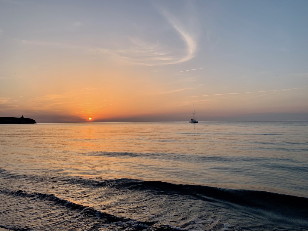 So entschlossen wir uns auch am nächsten Tag weiter zu fahren Richtung Süden, denn wir sehnten uns wieder nach einer ruhigen naturbelassenen Bucht. Seit gestern liegen wir jetzt hier vor dem langen Naturstrand Is Benas vor Anker. Wir genossen die Abendstimmung (bis die Moskitos auftauchten) und während des Abendpippispazierganges am Strand schoss ich dieses schöne Foto von Adesso und dem wunderschönen Sonnenuntergang.