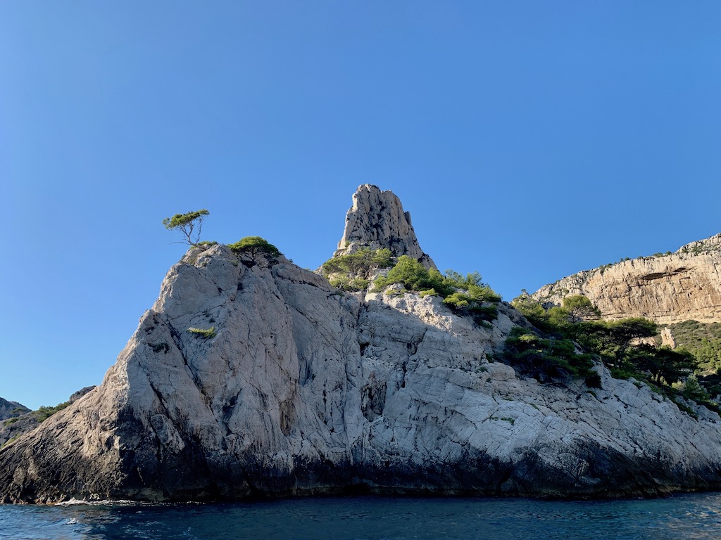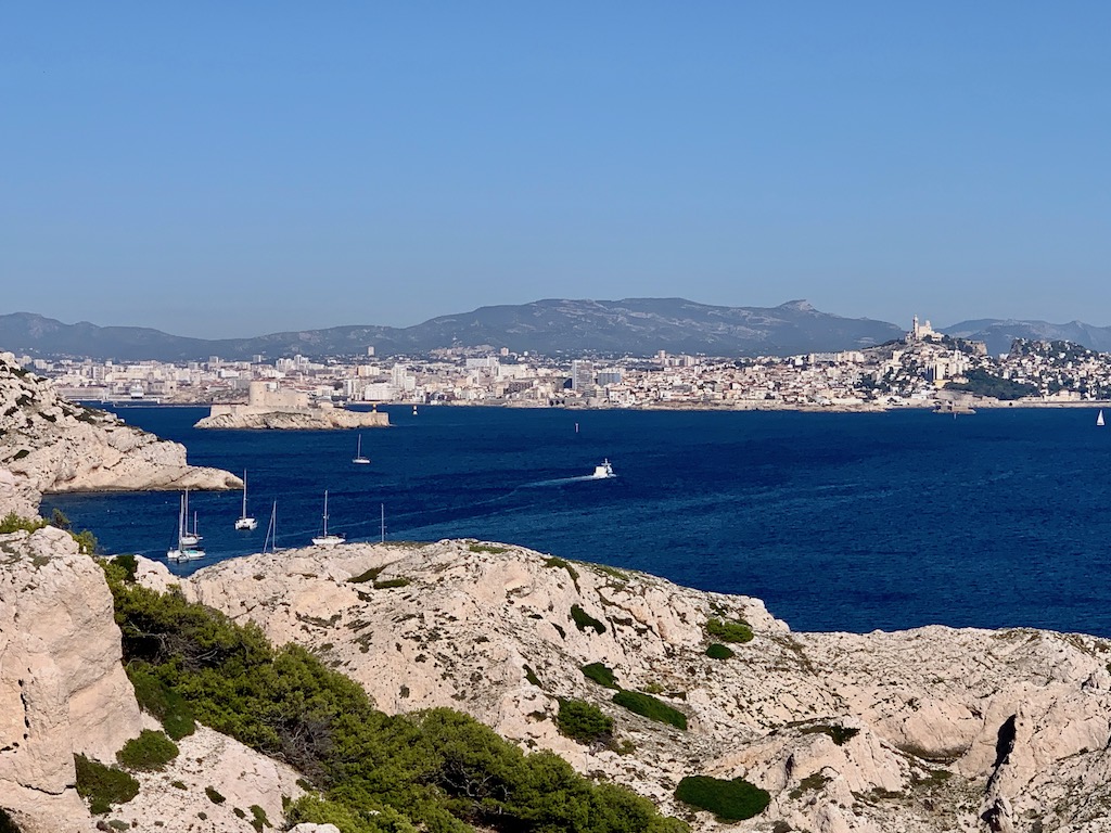 Nach dem Frühstück machten wir uns auf den Weg Richtung Île Frioul. Auch hier waren wir schon vor vielen Jahren mit einem gecharterten Boot im Hafen gewesen. Wir ankerten südlich des Hafens in einer der wenigen grösseren Ankerbuchten mit etwas Sandboden. Am Nachmittag fuhren wir mit dem Beiboot an Land und machten eine längere Wanderung bis hoch hinauf zum Fort de Caveaux. Von hier aus hatten wir einen tollen Ausblick über die Insel und auf Marseille im Hintergrund.