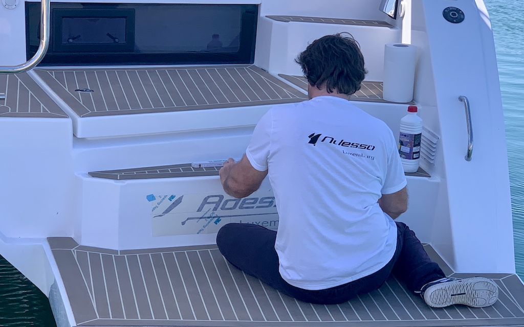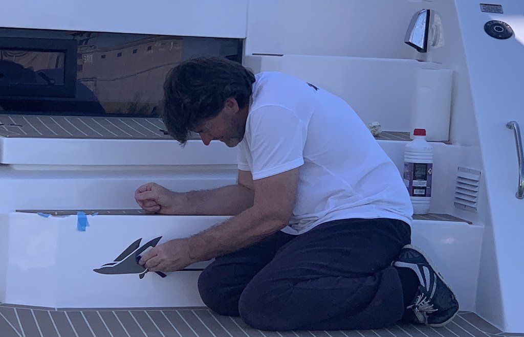 Noch rechtzeitig bevor sich wieder die nächsten Mistraltage ankündigten, brachte Guy ganz professionell unser Adesso-Logo hinten am Boot an.