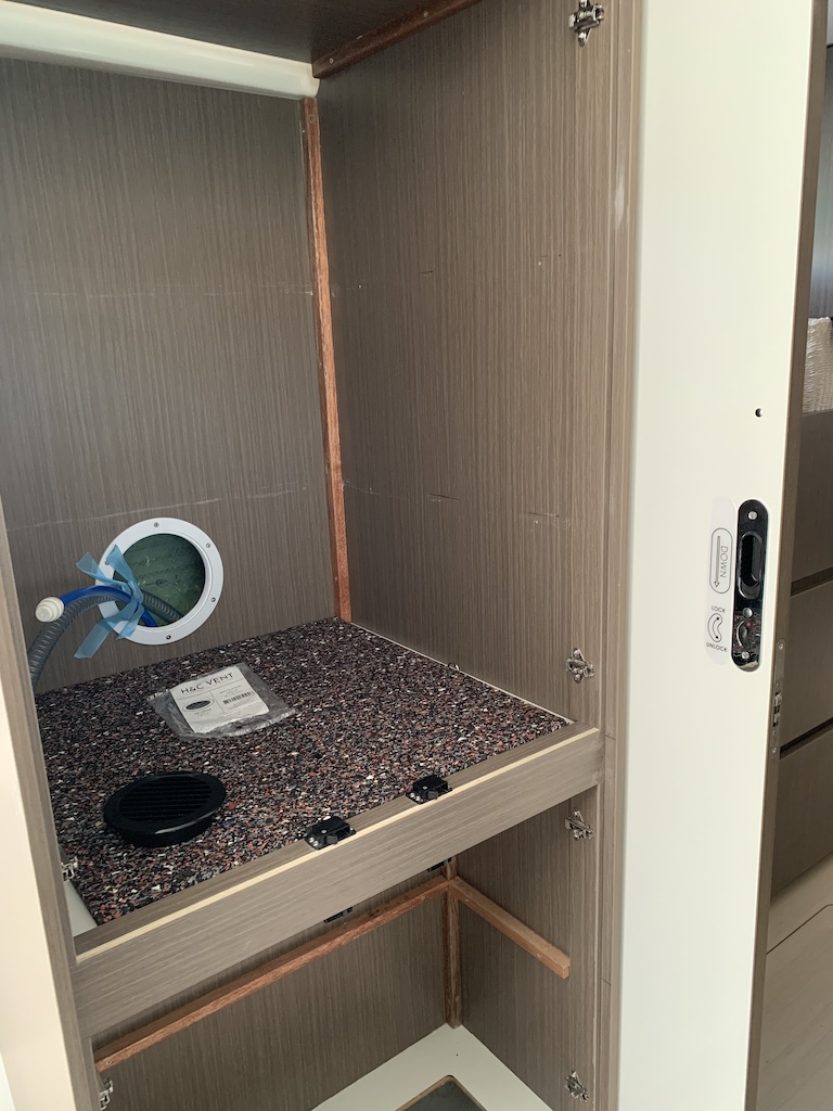 Eine weitere wichtige Anfangsbaustelle, um hier auf Adesso den Alltag zu bestreiten, war der Einbau der Waschmaschine. Wir hatten die Vorinstallation eigentlich mitbestellt, aber leider klappte das nur halbwegs. Der Wasseranschluss war wie geplant vorhanden, aber der Stromanschluss fehlte!!! Grrr…. „Kein Problem“, meinte Julien vom Aftersale Service, lasst den Anschluss hier vor Ort erledigen, wir bezahlen die Rechnung. Ja, klingt einfach und gut, aber so auf Anhieb steht ja kein Elektriker mal einfach so zur Verfügung um uns eine Steckdose im Waschmaschinenschrank zu installieren. Aber wir hatten Glück im Unglück, denn unser Ansprechpartner in der Werft, bei dem wir auch unsere Rumpfarbeiten in Auftrag gegeben haben, hat wirklich alles dran gesetzt, dass ein Elektriker seines Teams sich unseres Problems schnellstmöglich annimmt. Nach etwas mehr als einer Woche war es dann soweit. Wir konnten die Waschmaschine einbauen. Klingt einfach…war es aber nicht!