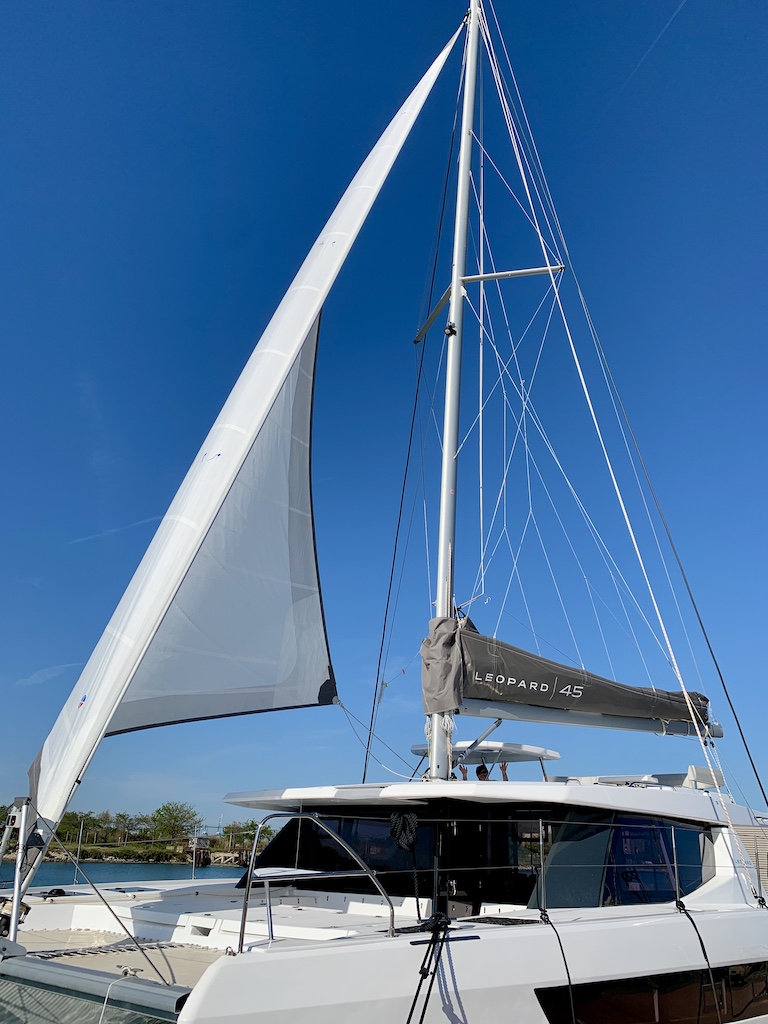 Gegen Mittag verabschiedeten sich Sébastien und Julien von Leopards Catamaran und machten sich auf den Weg zurück nach St. Raphael. Sie hatten uns ja die Lieferung unserer Adesso hier in Port Saint Louis ermöglicht, weil uns so viel Hin-und Hergerenne erspart blieb und wir so unsere Adesso fast einen Monat früher beziehen und mit den Umbauten beginnen konnten. Das hatte aber wahrscheinlich auch zur Folge, dass das Boot bei Weitem nicht so sauber und schön da stand, als wenn wir es, so wie normalerweise üblich, in St. Raphael entgegengenommen hätten. Sie hatten mit Sicherheit viel weniger Zeit, da sie noch drei Tage vorher in La Grande Motte auf der Multihullausstellung arbeiteten. So mussten wir ein bischen zähneknirschend in Kauf nehmen, dass unsere Adesso mit einer Mischung aus südafrikanischem Staub, Salz und Saharasand bedeckt war. Für mich ein trauriger Anblick, denn eigentlich hatte ich mir eine sauber, weiss strahlende Adesso vorgestellt…. Doch von „Weitem“ sieht sie doch schon ganz toll aus 🙂