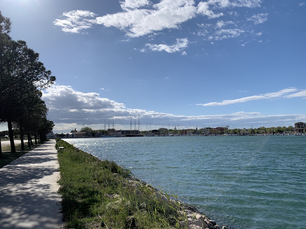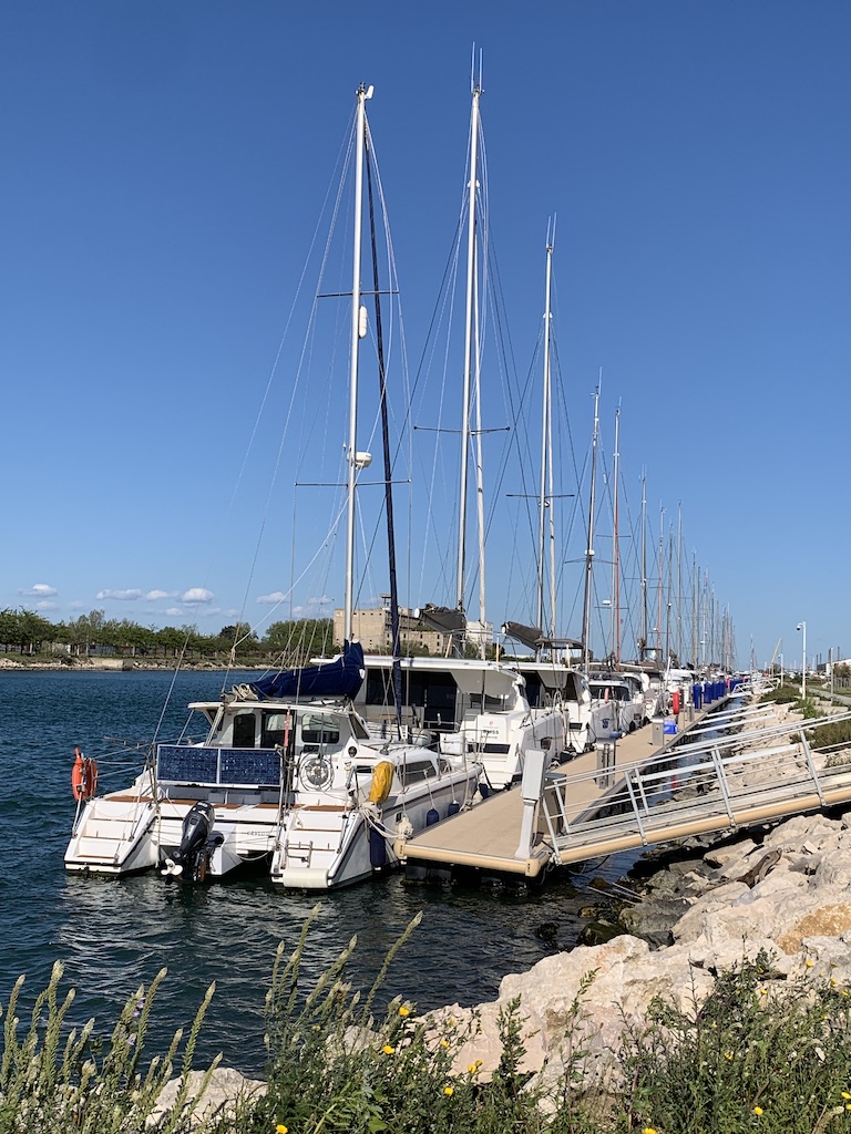 Ganze 5 Stunden dauerte der Einbau. Um das gute Ding an seinen Ort zu schaffen, musste Guy nicht nur die Schranktüren, sondern auch die Badezimmerschiebetür ausbauen. Nur so passte sie durch. Nein, ich habe kein extragrosses Modell gekauft, sondern genau das, was auch original von der Werft eingebaut wird, aber wahrscheinlich bevor die Schränke und Türen montiert werden… Warum wir sie nicht ab Werft bestellt haben? Weil wir definitiv nicht bereit waren fast 2500 Euro für eine Waschmaschine zu bezahlen, die man im Handel für etwas mehr als 700 Euro kaufen kann. Die Schufterei hat sich also gelohnt, fast 1500 Euro gespart! Nach getanener Arbeit brauchte ich eine kleine Abwechslung und machte einen kurzen Spaziergang durch das hier angrenzende neu angelegte Parkgelände. Hier ein Blick auf das Hafenbecken von Port St Louis du Rhône und den langen Katamaransteg an dem wir auch im Moment mit unserer Adesso liegen.