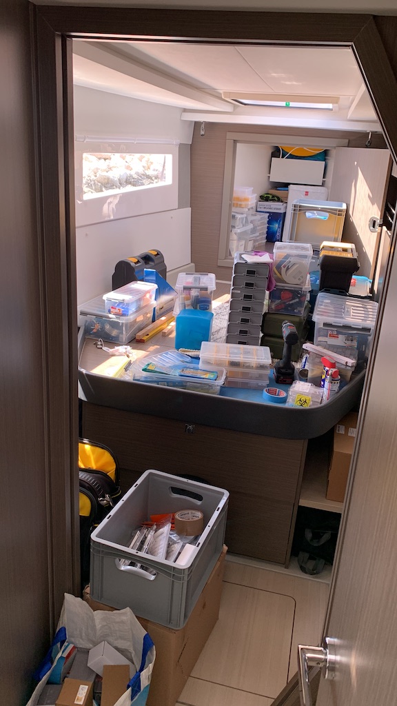 Während Guy sich Gedanken darüber machte, wo und mit welcher Baustelle er anfangen würde, leerte ich eine Transportbox nach der nächsten und versuchte alles so „logisch“ wie möglich zu verstauen, wohlwissend, dass ich das Meiste bestimmt noch mehrmals aus-und wieder neu einräumen werde.