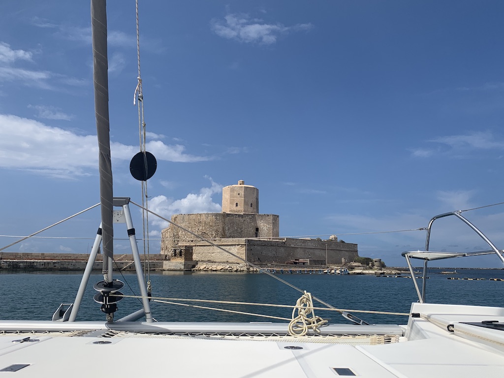 Nach 1-2 Stunden wirkte die Spritze und es ging Guy ein klein wenig besser, so dass er es sogar schaffte bis an den Steuerstand zu kommen. Er versicherte mir, dass er für die Einfahrt in den Hafen von Trapani, mir am Steuerstand helfen könnte und ich so hier nicht alleine ankern müsste. Das beruhigte mich ungemein, denn hier ist der Platz doch ziemlich begrenzt und es gibt vor allem viel Schiffsverkehr. Es klappte, wir fanden einen guten Ankerplatz und der Anker hielt auf Anhieb. Seitdem stehen wir wieder zwischen dem Torre Peliade/Castello di Mare und der Hafenmauer und hoffen jetzt hier genug Schutz zu haben vor den bevorstehenden zwei Starkwind-und Gewittertagen.