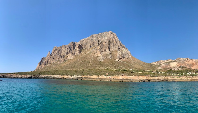 Als wir in der Bucht Cornino vor dem markanten Berg Cofano ankamen, mussten wir ernüchternd feststellen, dass auch hier der Andrang sehr gross war. Am Strand lag alles voll und in der Bucht standen viele kleine Motorboote, wahrscheinlich alle die, die nicht zu den ägadischen Inseln fahren wollten. Als diese am Abend die Bucht verliessen, ankerten wir noch einmal um, um mehr Distanz zum Strand und den Menschenmassen zu haben. Hier blieben wir 3 Tage vor Anker. Es war definitiv nicht die perfekte Ankerbucht, tagsüber viel Tumult und abends Musik bis kurz vor Mitternacht aber wenigstens war danach etwas Ruhe…bis am Morgen gegen 6 Uhr, die Mülleimer geleert und der Strand mit dem Bagger gesäubert wurde… Aber der Blick auf den imposanten Monte Cofano war schon toll.