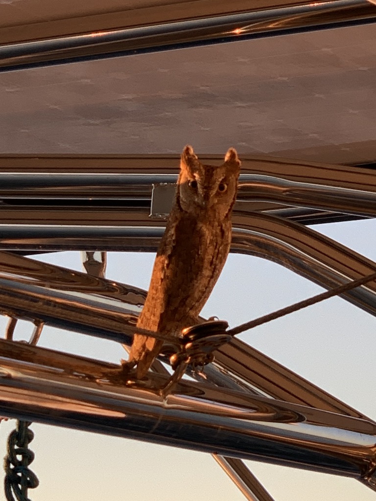 Mit ihren grossen Augen beobachte die Waldohreule jede einzelne meiner Bewegungen aber entschied sich erstmal nicht weg zu fliegen, sondern bei uns auf Adesso zu bleiben. Ich machte Frühstück, deckte den Tisch… und fühlte mich ein bischen beobachtet ;-). Während des Frühstücks blieb sie regungslos sitzen und schaute uns zu… so süss! Erst als wir dann später anfingen, das Boot für unsere Abfahrt klar zu machen, flog sie weg und verschwand in den Pinienhängen entlang der Küste.