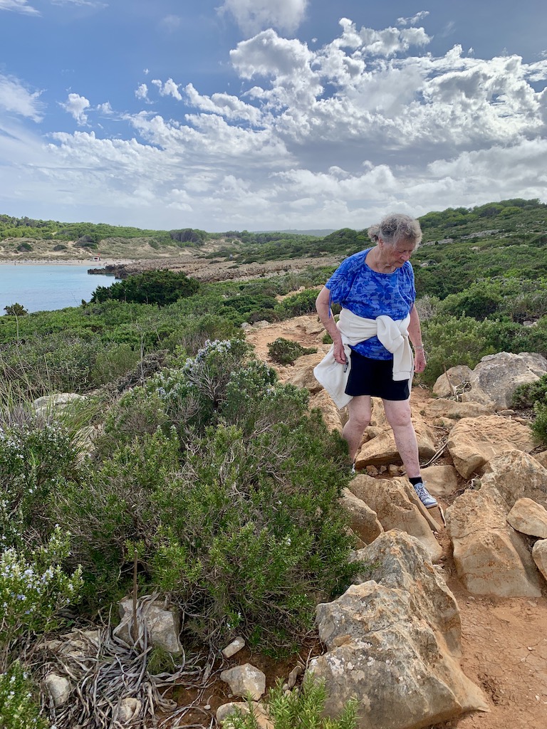 Am folgenden Tag beruhigten sich die Wellen auf der Nordseite, so dass wir beschlossen, in eine andere Ankerbucht zu wechselen. Schliesslich sollte meine Mutter doch noch etwas von Menorca zu sehen bekommen. Alternativ hätten wir auch einen Tagesausflug nach Mahon machen könnten, aber erstens wäre die Fahrt mit dem Beiboot ziemlich unangenehm geworden wegen der Windwellen aus Süd und zweites hätten wir am kommenden Tag keinen Segelwind mehr gehabt und wenn Wind, dann voll auf die Nase. So entschieden wir uns also bis in die Bucht Arenal de Son Saura zu segeln. Es war ein angenehmer Segeltag und meine Mutter genoss die Fahrt vorne in der gemütlichen Sitzecke auf Adesso. Dies ist auch mein Lieblingsplatz, wenn wir unterwegs sind und wir nicht gerade hart am Wind segeln. Wir waren nur zwei Boote in der Bucht und verbrachten hier einen angenehmen Abend und eine ruhige Nacht. Am nächsten Tag entschieden wir uns den Küstenweg Richtung Cala Pudent zu erkunden. Guy brachte meine Mutter und mich rüber zum Strand, zog es aber selbst vor an Bord zu bleiben, weil am Nachmittag wieder Starkwind mit über 25 Knoten vorausgesagt waren. So machte ich mich mit meiner Mutter auf den Weg. Es war ein richtig schöner Küstenweg, mit immer wieder tollen Ausblicken, überall dichte Vegetation.
