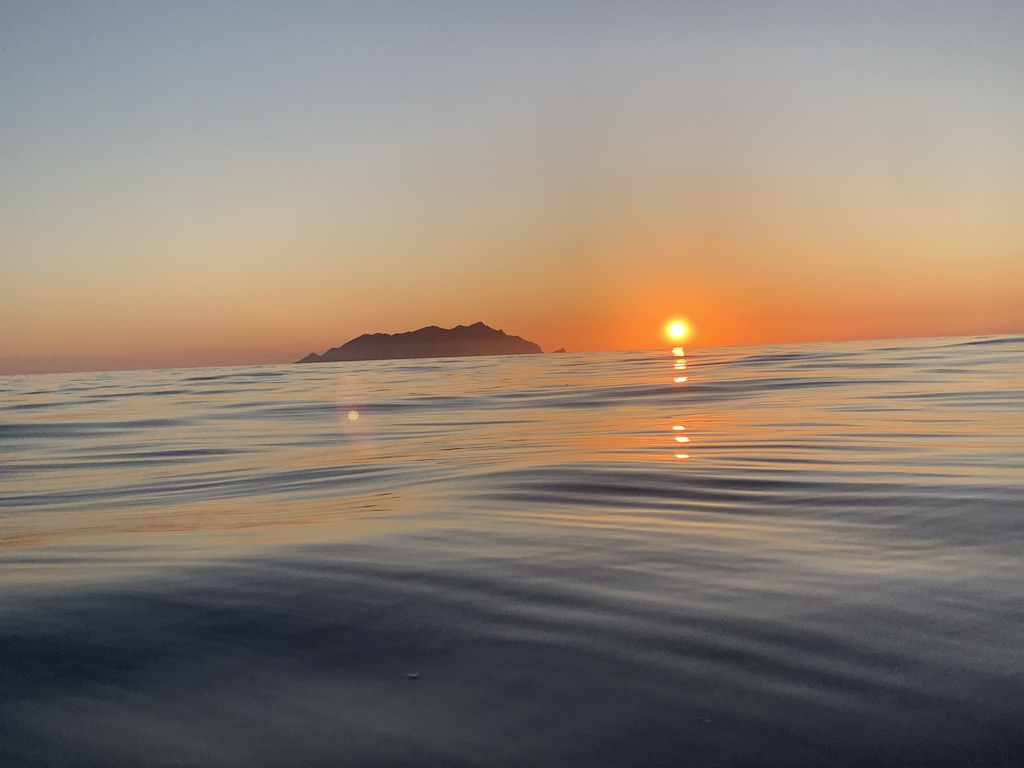 Nach dem Abendessen, entschieden wir uns, das Beiboot noch einmal zu Wasser zu lassen, um den Sonnenuntergang mit Blick auf die Insel Marettimo in vollen Zügen geniessen zu können.  Kurz vor Sonnenuntergang sind wir aus der Bucht rausgefahren… machten den Motor aus, liessen uns hin-und herschaukeln und schauten einfach nur zu… immer wieder so schön.