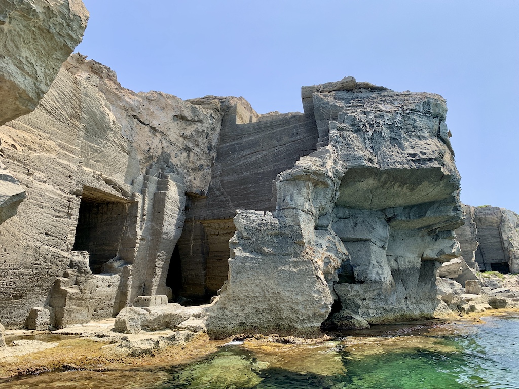 Anschliessend sind wir weiter in die Bucht Cala Rossa gesegelt, die sich an der Nordostecke von Favignana befindet und bekannt ist für seine spektakuläre Felsformation die noch aus der Zeit des Kalkarenitabbaus stammen. Am Nachmittag machte ich mich mit dem SUP auf den Weg um mir in aller Ruhe diese Küstenlandschaft vom Wasser aus anzusehen.