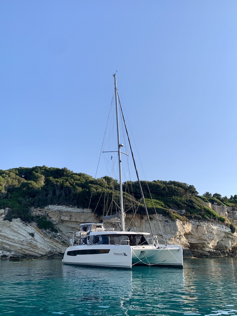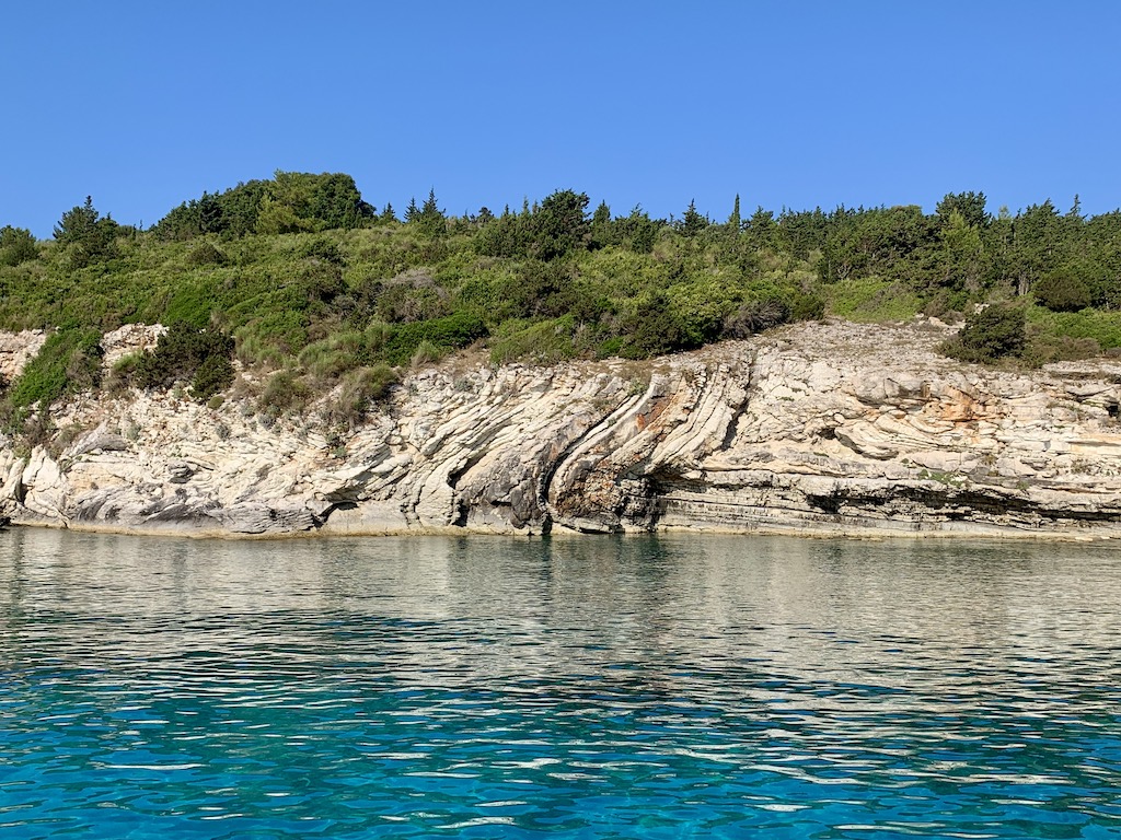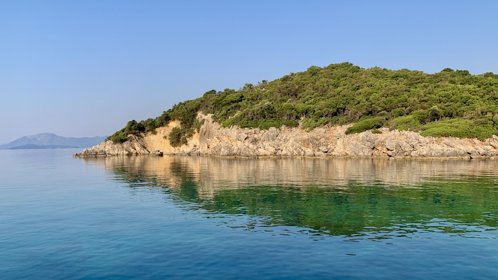 Nach einer Woche auf Paxos, begannen wir uns über die möglichen nächsten Ziele und die Öffnungszeiten der Lefkadabrücke zu informieren, denn so langsam wollten wir nach Süden aufbrechen um dem zunehmenden Tumult hier auf Paxos zu entfliehen. Da für die kommenden Tage nur sehr wenig Wind und fast keine Wellen vorausgesagt waren, entschieden wir uns erstmal nach Antipaxos weiter zu fahren um „unser Glück“ hier in einer kleinen Bucht zu finden. Unser Anker fiel dann in einer sehr idyllischen Bucht vor dem kleinen Sandstrand Plaka und einem einzelnen Häuschen. Ich machte mich sofort mit dem SUP auf Erkundungstour und genoss ein ausgiebiges Bad. Am späten Morgen gesellten sich noch ein paar Boote hinzu, aber jeder verhielt sich „friedlich“ und genoss die Ruhe. Wir freuten uns schon auf eine ruhige Nacht hier vor Anker, als am Nachmittag eine grosse Motoryacht um die Ecke bog. Sie drehte in die Bucht hinein und verweilte eine Zeit lang hinter uns. Dann kam ein Crewmitglied mit dem Beiboot und fragte, ob und wann wir wegfahren würden. Als wir ihm sagten, wir würden nicht wegfahren, merkten wir schon, dass das nicht die Antwort war, die er sich erhofft hatte. Die Motoryacht verweilte hartnäckig etwas ausserhalb der Bucht. Nach einiger Zeit tauchte er wieder in seinem Beiboot auf und meinte, wir sollen umankern, da wäre ja noch genug Platz für uns weiter hinten in der Bucht. Wir sagten ihm, dass wir nicht umankern würden, da der Wind in der Nacht drehen würde und wir nicht so nah an den Felsen ankern wollten und dass wir halt vor ihnen da waren und sie dann zu einem anderen Ankerplatz fahren müssten. Anstatt sich nach einem anderen Ankerplatz umzuschauen, nahmen sie Kurs in unsere Richtung und liessen ihren Anker einige Meter hinter Adesso fallen und fuhren sehr dicht an uns vorbei um sich dann vor uns mit Landleinen am Felsen festzumachen.