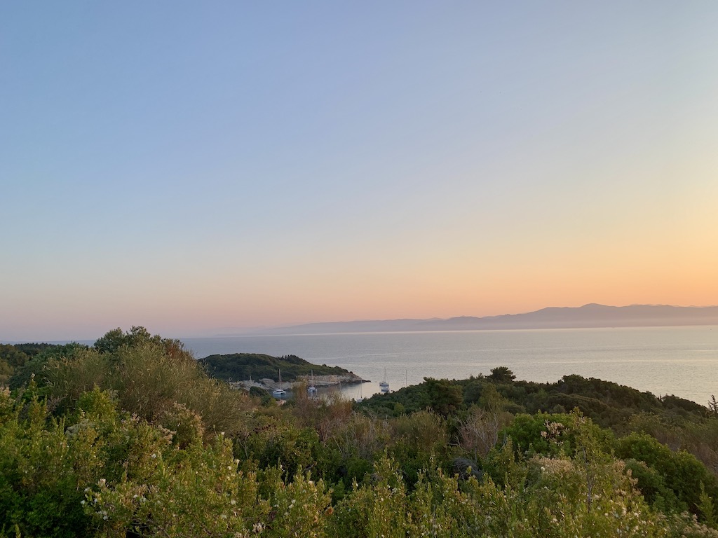 Hier gefiel es mir richtig gut und endlich konnten wir diese Insel auch mal stressfrei geniessen und so verbrachten wir einen sehr angenehmen Tag hier. Am nächsten Morgen machte ich mich kurz vor Sonnenaufgang auf den Weg zum Leuchtturm am südöstlichen Teil von Antipaxos. Der schmale Weg führte zuerst den Hang hinauf, vorbei an ein paar kleinen Häusern mit Olivenbäumen und Weinreben.