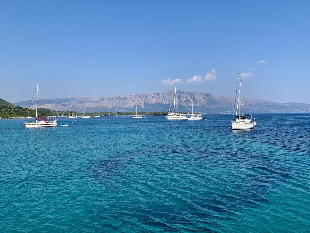 Am Nachmittag wurde die Bucht aber stündlich voller und von jeder Ecke war eine andere Musik zu hören. Diese Bucht war also kein Geheimtipp, sondern ein beliebtes Ziel der Griechen um das Wochenende einzuläuten und bei Charteren, um ihren letzten Urlaubstag zu feiern, bevor sie ihr Boot wieder abgeben müssen. Am Abend wurde es dann aber wieder deutlich ruhiger, was wir wirklich begrüssten. Am nächsten Tag wollten wir weiter… wohin, hing noch vom Wetter ab…entweder Ithaka oder Meganisi oder Kalamos … das werden wir am nächsten Morgen entscheiden…mehr dazu im nächsten Blog.