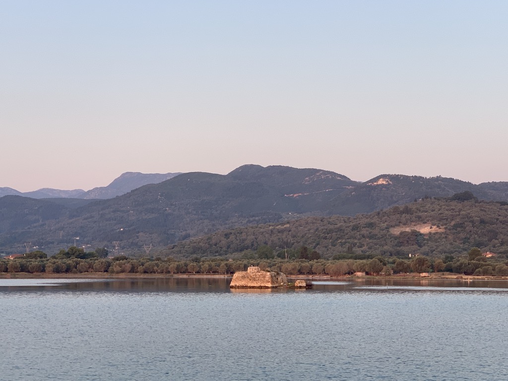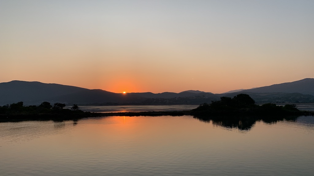 Am nächsten Morgen starteten wir kurz vor Sonnenaufgang, denn wir wollten den Lefkadakanal in aller Ruhe hinabfahren, die Athmosphere geniessen und dann in unserer nächsten Ankerbucht, in Bathyabali, am griechischen Festland, unweit des Kanals, gemütlich frühstücken. Unser Plan ging auf, denn es herrschte echt eine tolle Morgendämmerungsstimmung und wir waren noch ganz allein unterwegs, ausser ein paar kleinen Fischerbooten.