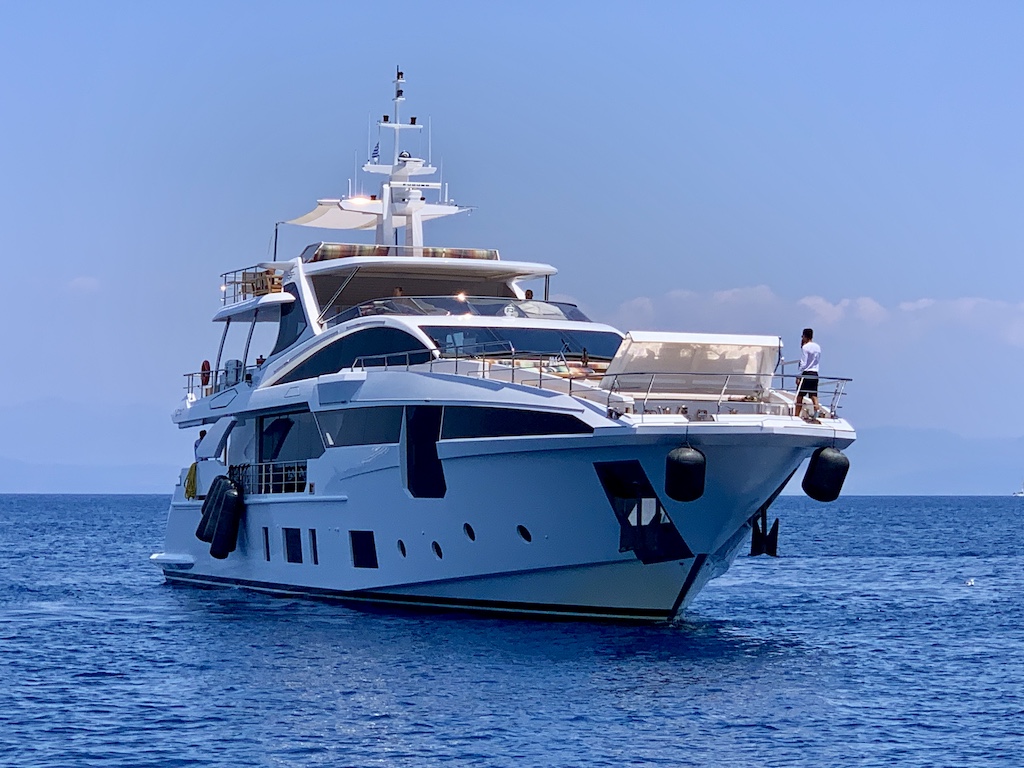 Ich kochte innerlich, ich war auf 100 Tausend… Das ist auf jeden Fall ein Punkt, der mir hier in Griechenland ganz und gar nicht gefällt, nämlich, dass diese riesen Motoryachts bis in die kleinsten Buchten reinfahren dürfen und sich direkt neben kleine Segelyachten an den Felsen festmachen können. Das zerstört jede idyllische Buchtenathmosphere…und dann läuft auch noch pausenlos ihr Stromgenerator, sie rennen mit ihren Jetskis rum und und und…. ich sehe inzwischen jedesmal „rot“, wenn ich eine Motoryacht ankommen sehe… Da macht die Regel in Frankreich wirklich Sinn, dass diese grossen Yachten 300m abseits der Küste ankern müssen.