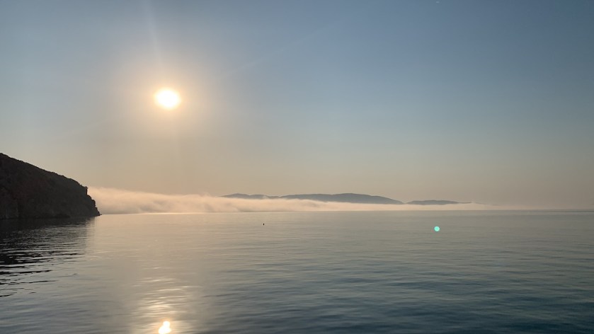 Wir verbrachten schlussendlich vier Tage und 3 Nächte hier vor Anker. Mittags kamen immer mal für kurze Zeit ein paar Touriboote vorbei, die dann ein erfrischendes Bad genossen und dann aber bald wieder wegfuhren, so dass wir den grössten Teil der Zeit die Bucht für uns ganz alleine hatten. Ich ging viel schnorcheln, schrubbte ein bischen an unserem Unterwasserschiff und genoss einfach nur diese Ruhe hier. Leider war das Betreten der Insel nur mit schriftlicher Erlaubnis der Forstverwaltung gestattet, denn die Insel wird nur zu Jagdzwecken betreten. Für den Rest der Zeit soll die Fauna und Flora ungestört bleiben. Mir hat es hier wirklich sehr gut gefallen… An einem Morgen war die Stimmung schon fast märchenhaft, fast wie ein Gemälde dank des Morgennebels, der noch über dem Meer lag 🙂