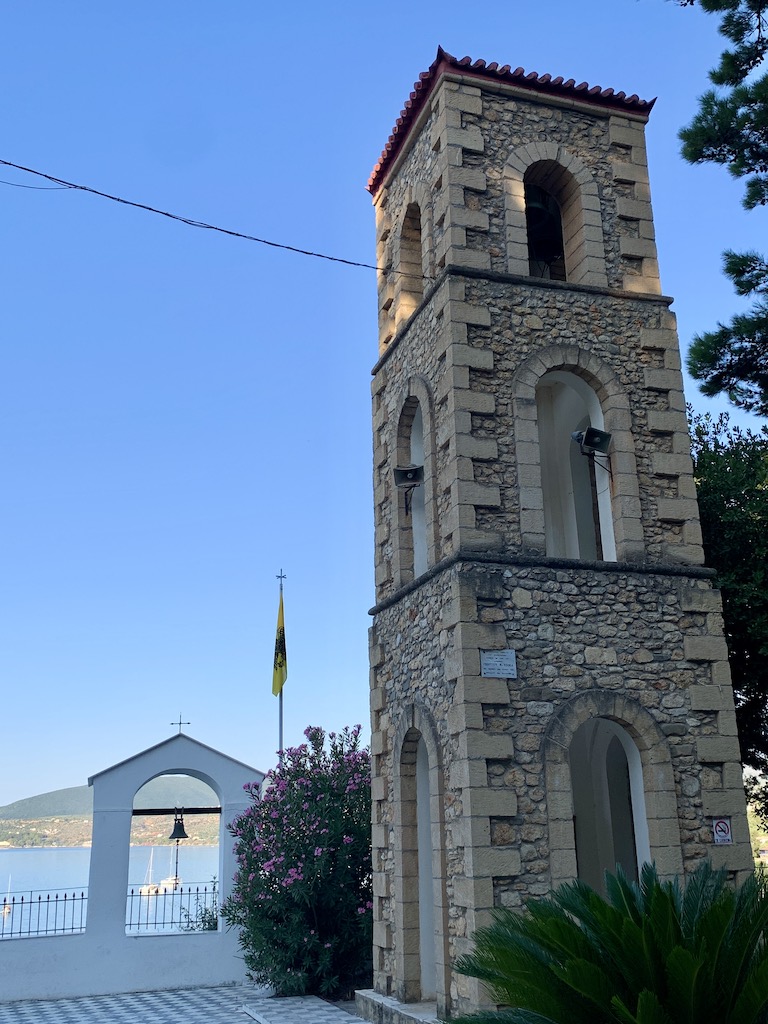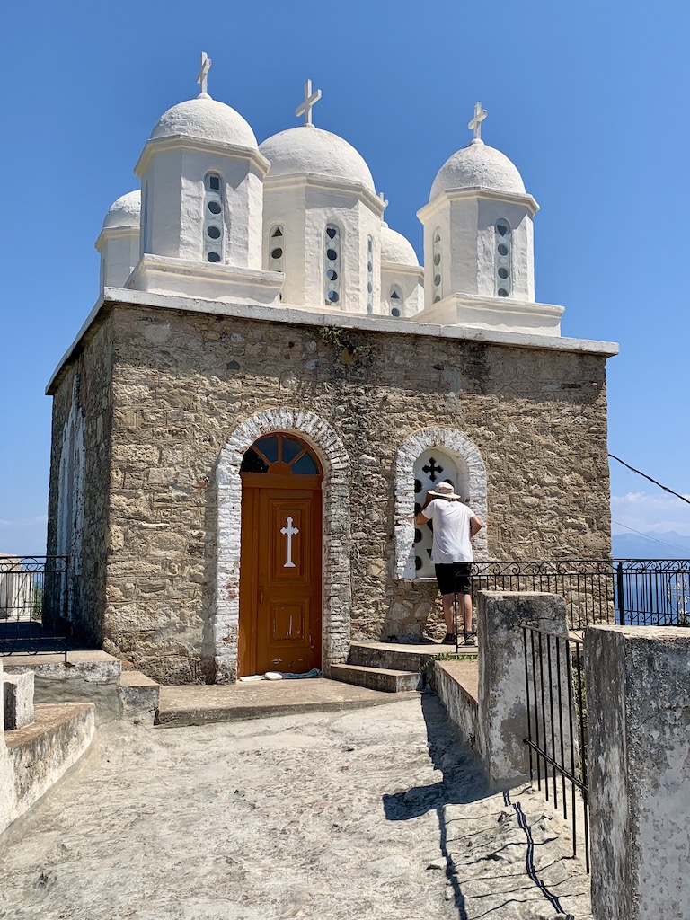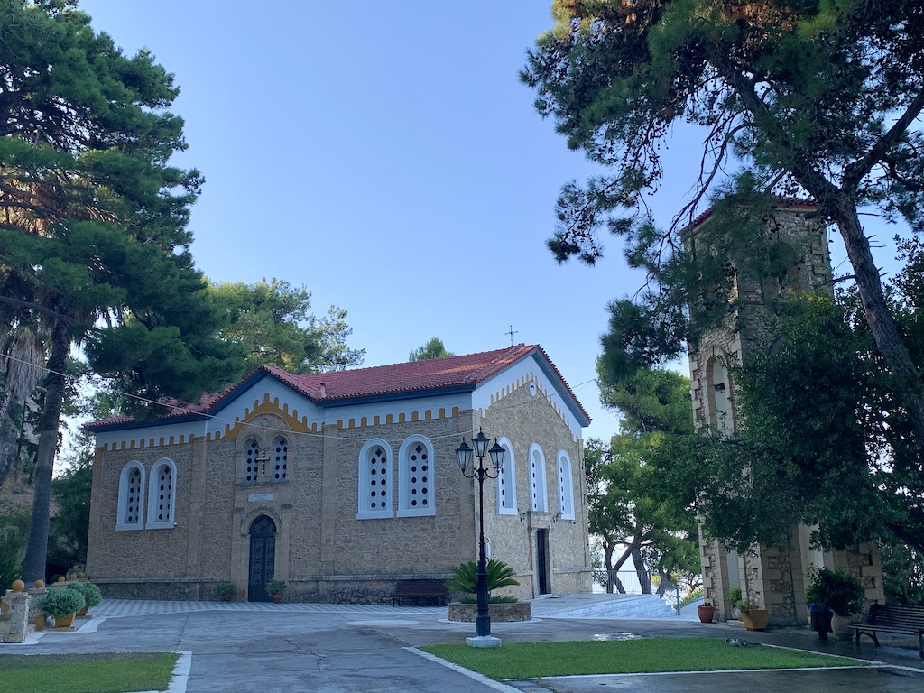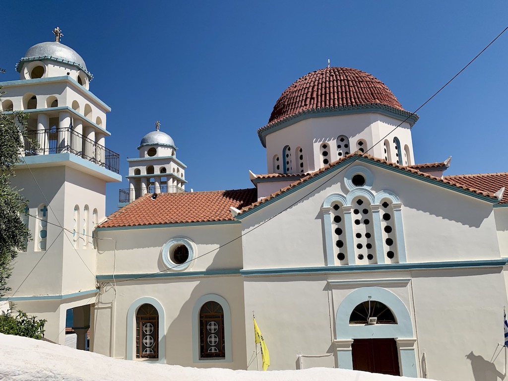 Bevor ich zu Adesso zurückkehrte, machte ich noch einen kleinen Abstecher ins Dorf hinauf bis zur Panagia Eleistria Kirche. „Sie stammt aus dem 19. Jahrhundert und wurde am 26. Dezember 1900 eingeweiht. Jährlich feiern die Einheimischen Ende Januar ein Fest und erinnern an den Fund der heiligen Ikone Ende des 19. Jahrhunderts. Ursprünglich war das Gebäude als dreikuppelige Kirche erbaut worden. Leider nutzten die deutschen Besatzer einen der Türme als Munitionslager. Ehe sie im Jahr 1944 abzogen, sprengten Sie den Turm mitsamt der darin enthaltenen Munition in die Luft und zerstörten ihn vollständig. Der zweite Turm ist jedoch erhalten und von innen zugänglich. Von dem Gelände um die Kirche bietet sich Ihnen ein unvergesslicher Ausblick auf das offene Meer und das bezaubernde Fischerdorf.“