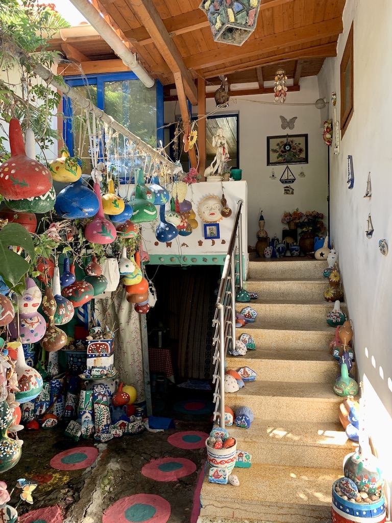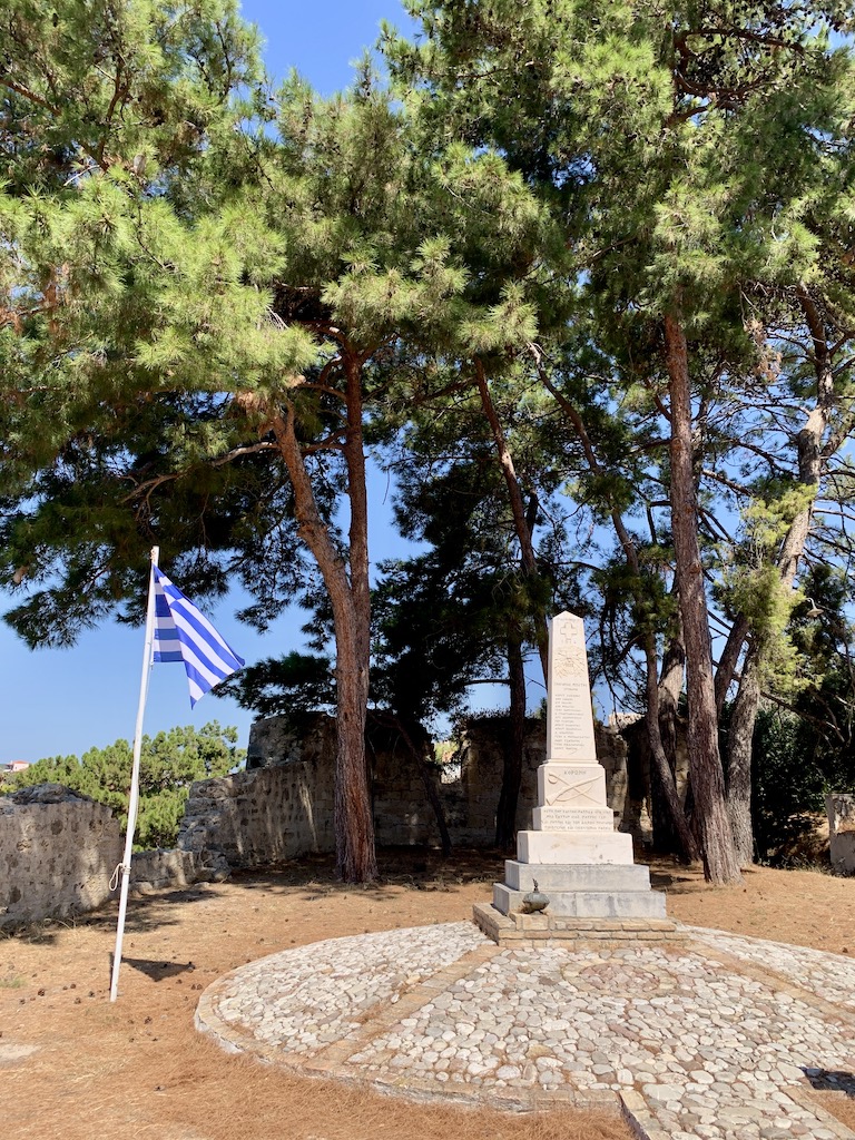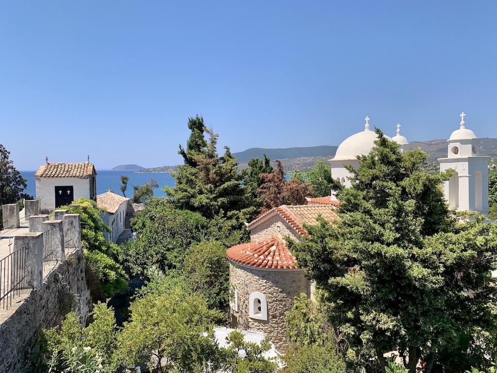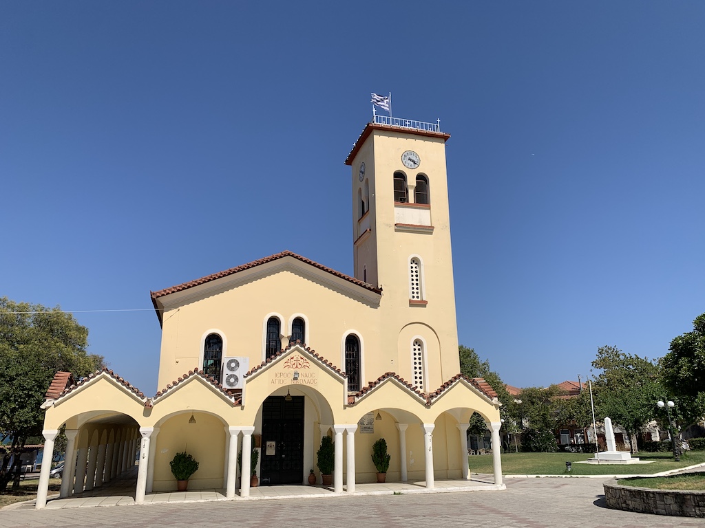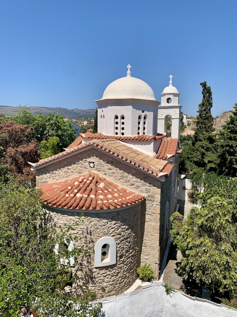 Bevor ich zu Adesso zurückkehrte, machte ich noch einen kleinen Abstecher ins Dorf hinauf bis zur Panagia Eleistria Kirche. „Sie stammt aus dem 19. Jahrhundert und wurde am 26. Dezember 1900 eingeweiht. Jährlich feiern die Einheimischen Ende Januar ein Fest und erinnern an den Fund der heiligen Ikone Ende des 19. Jahrhunderts. Ursprünglich war das Gebäude als dreikuppelige Kirche erbaut worden. Leider nutzten die deutschen Besatzer einen der Türme als Munitionslager. Ehe sie im Jahr 1944 abzogen, sprengten Sie den Turm mitsamt der darin enthaltenen Munition in die Luft und zerstörten ihn vollständig. Der zweite Turm ist jedoch erhalten und von innen zugänglich. Von dem Gelände um die Kirche bietet sich Ihnen ein unvergesslicher Ausblick auf das offene Meer und das bezaubernde Fischerdorf.“