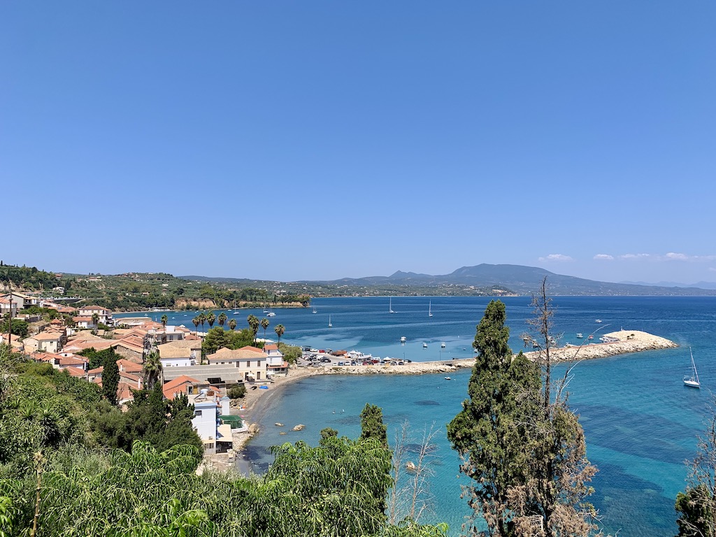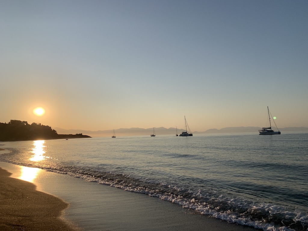 Am zentralen Dorfplatz, rundum der ortodoxen Kirche, versammelt sich dann gefühlt die ganze Dorfgemeinschaft. Kinder spielen mit dem Ball, fahren Fahrrad, klettern auf die Bäume, die Erwachsenen schauen dem ganzen Treiben von einer der vielen Sitzbänke zu oder genehmigen sich einen Mythos (griechisches Bier). Wir beobachten das Ganze von einer kleinen Taverne mit nur 5 Tischen aus, während wir auf unseren Pita-Gyros warteten. Auf dem Weg zurück zu unserem Beiboot, dämmerte es schon und die Bucht erstrahlte in wunderschönen rötlichen Farben.