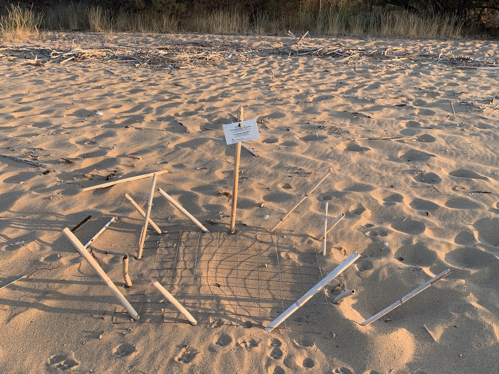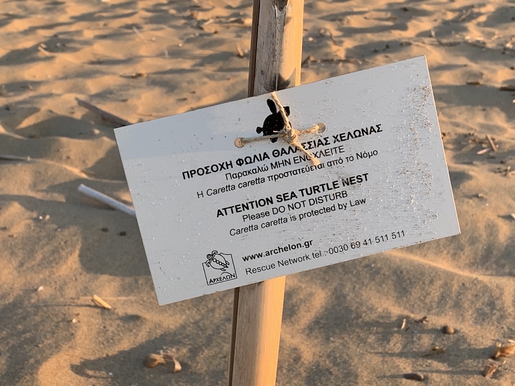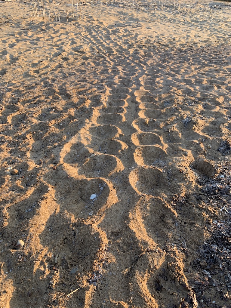 Zwischen Mai und September kommen die Karettschildkröten hierher um ihre Eier abzulegen. An 4 Orten hier auf den Peloppones werden die Nester von der Naturschutzorganisation ARCHELON überwacht und dokumentiert. Die Nester stehen unter strengem Schutz, was ich wirklich toll finde. Daher müssen diese Strände auch so naturbelassen wie möglich bleiben… keine Liegestühle, keine Sonnenschirme, keine Bars mit Musik oder starken Lichtquellen usw. Als ich am Strand entlang spazierte, entdeckte ich ein ganz frisches Nest, wahrscheinlich von dieser Nacht. Man konnte noch ganz klar die Spuren der Schildkröte erkennen, wie sie sich den Strand hoch bewegte. Schnell schnappte ich mir ein paar Schilfrohre um das Nest zu markieren.