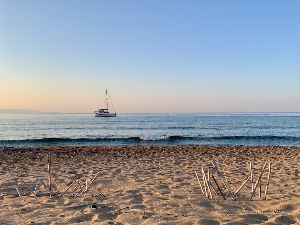 Als wir ankamen hatten wir hier ganz guten Schutz und standen ruhig vor Anker, aber am späten Nachmittag änderte der Wind innerhalb weniger Minuten seine Richtung und blas dann mit 15 Knoten voll in die Bucht hinein… und mit ihm kamen die Wellen… als es zunehmend unangenehmer wurde, entschieden wir, um die Ecke mit der Festung rum zu fahren um vor dem weitläufigen Strand Zaga an der Westseite von Koroni zu ankern. Eine gute Idee, wir hatten hier zwar immer noch viel Wind, aber standen im Wellenschutz…viel besser! Zwar wurde es in der Nacht, als der Wind abflachte und Adesso sich seitlich in die Wellen legte, ziemlich wackelig, aber wir standen hier mit Sicherheit trotzdem besser als vor Koroni. Kurz vor Sonnenaufgang paddelte ich mit dem SUP an Land und hatte noch den ganzen Sandstrand für mich ganz alleine. Ein Genuss!!! Ich schlenderte an den vielen Schildkrötennestern vorbei und erfreute mich an dem Gedanken, dass hier Tausende kleine Schlidkröten heranwachsen 🙂 🙂 🙂