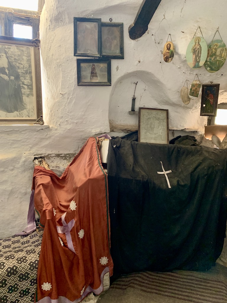 Die folgenden zwei Fotos zeigen ein „Zimmer“ in dem wohl früher einmal ein Geistlicher gelebt und vor allem wohl gebetet hat… die Tür war so schmal, dass wir seitlich durchgehen mussten und das Zimmer war vielleicht 1,5 x 1m… wirklich total winzig… das muss man wollen…!