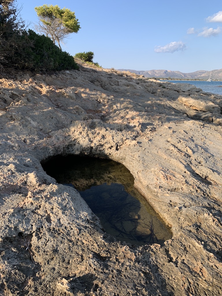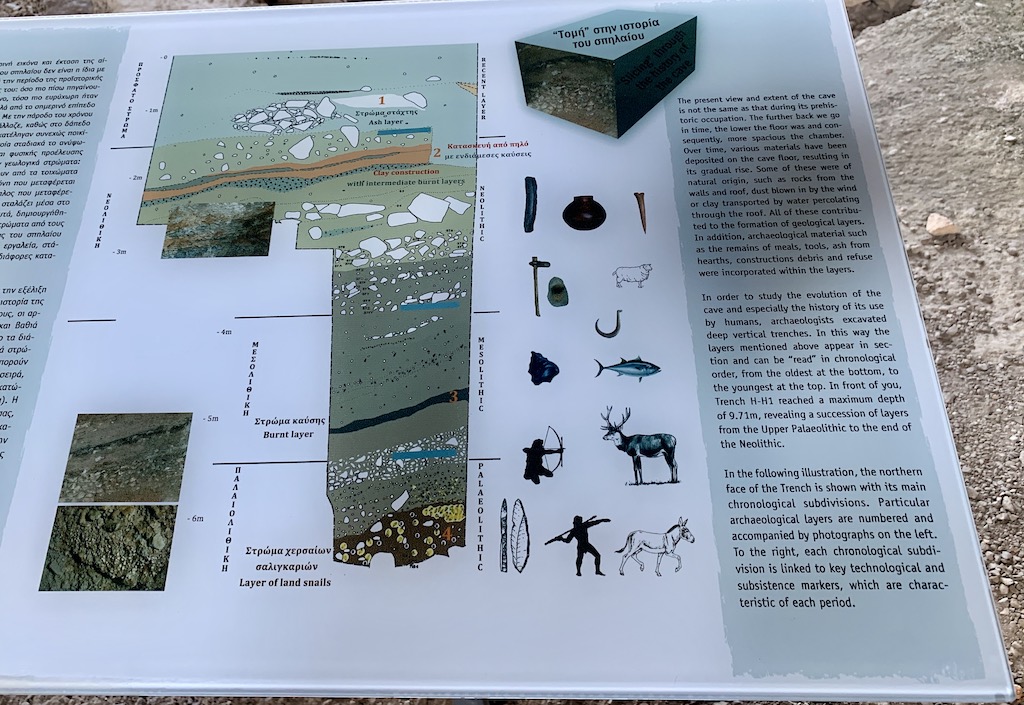 Hier sind wir sehr gut gegen Wind und Wellen aus fast jeder Richtung geschützt, was sehr angenehm ist. Heute morgen haben wir die Franchthi-Höhle hier in der Bucht besucht, wo man die ältesten Überreste menschlicher Aktivitäten und den ältesten Skelett eines Menschen hier in Griechenland gefunden hat. Die Höhle ist wirklich gross aber leider ist inzwischen sehr viel zusammengestürzt und es ist schwer vorstellbar wie es damals wohl ausgesehen hat.