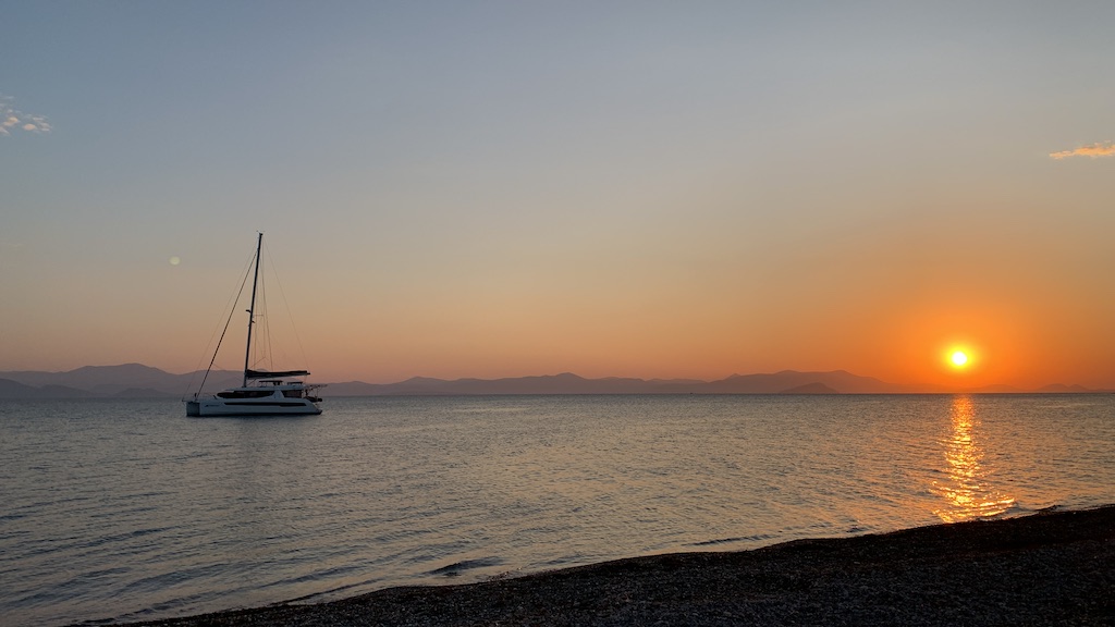 Unser Ziel am nächsten Tag war Strecke Richtung Norden machen und da der Wind wieder aus Norden kam (wie fast jeden Tag am Vormittag), hiess es wieder Aufkreuzen. Aber dieses Mal hatten wir genug Wind und machten richtig Fahrt. Als der Wind am frühen Nachmittag deutlich abnahm, fuhren wir in eine Bucht und ankerten vor einem schönen Kieselstrand. Eigentlich hatten wir vor, hier zu übernachten, aber als der Südwind sich dann einstellte (wie fast an jedem Nachmittag), mit über 15 Knoten, und so auch die Wellen höher wurden und den Weg in die vermeindlich geschützte Bucht fanden, entschieden wir uns spontan dazu, den Wind zu nutzen um weiter Strecke zu machen. Also wurde schnell unser Code D ausgepackt und Anker auf. Schlussendlich fiel unser Anker in der Abenddämmerung in der naturbelassenen Bucht Voria Kinouria südlich des Dorfes Paralio Astros.