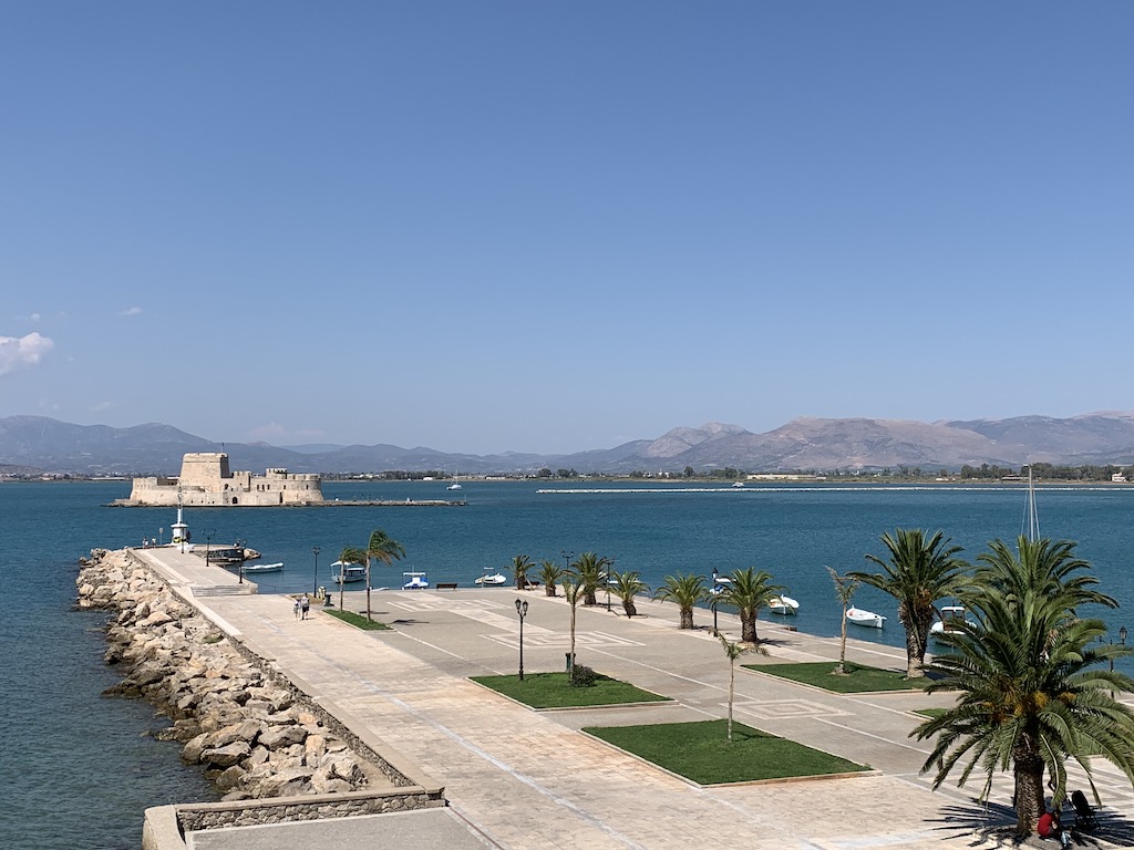 Am nächsten Morgen nahmen wir Kurs Richtung Nafplio. Über Naflpio hatten wir gehört, dass es zu den schönsten Städten Griechenlands gehört und es hier eine sehr beeindruckende venezianische Festung zu bestaunen gibt die hoch oben auf dem Berg trohnt und die grösste und schönste ihrer Art sein soll. Dank unseres Leichtwindsegels konnten wir die ganze Strecke unter Segel zurücklegen. Wir ankerten hinter der grossen Aussenmole des Hafens und hatten von hier aus einen schönen Blick auf Nafplio, die Festung Palamidi und das vorgelagerte Fort Bourtzi.