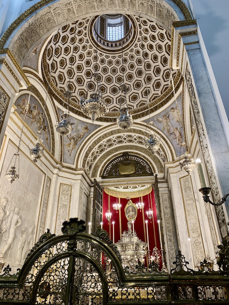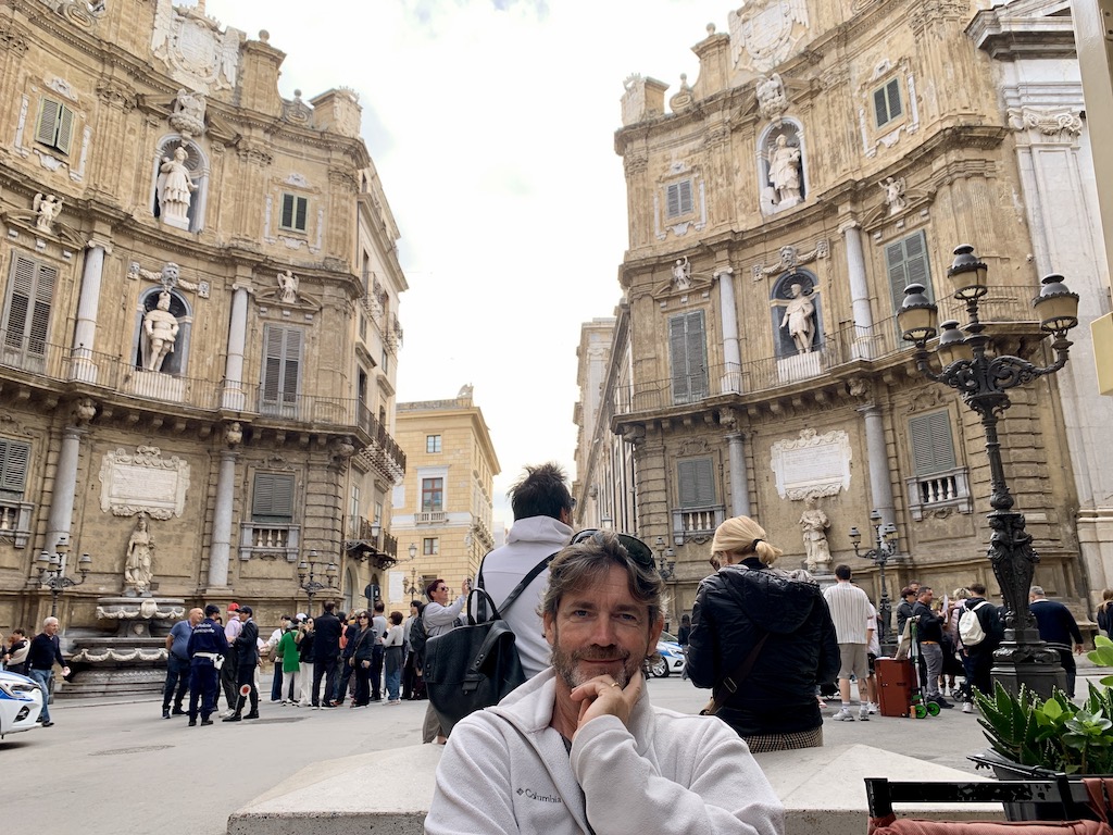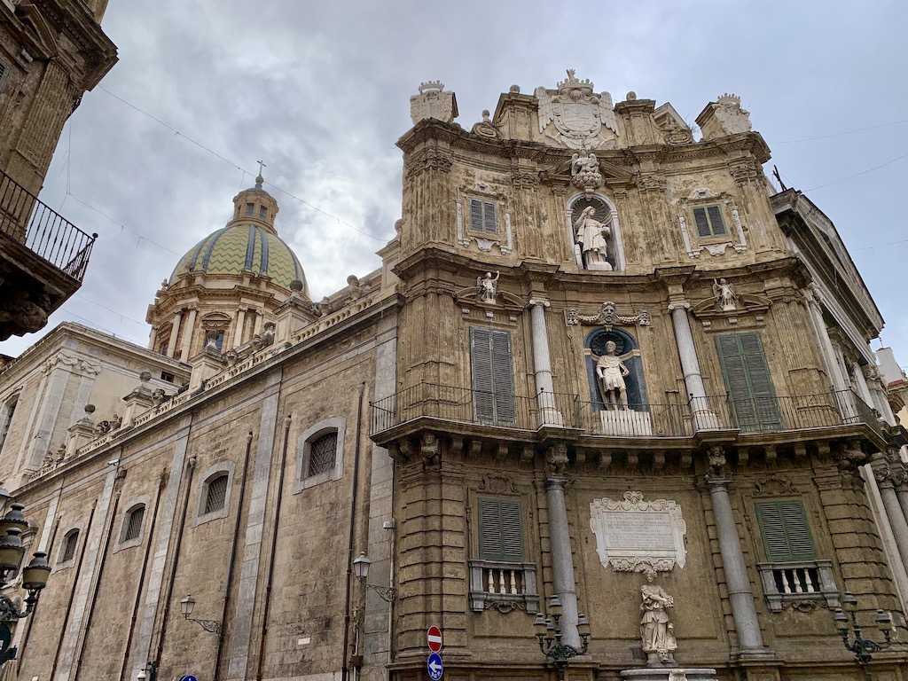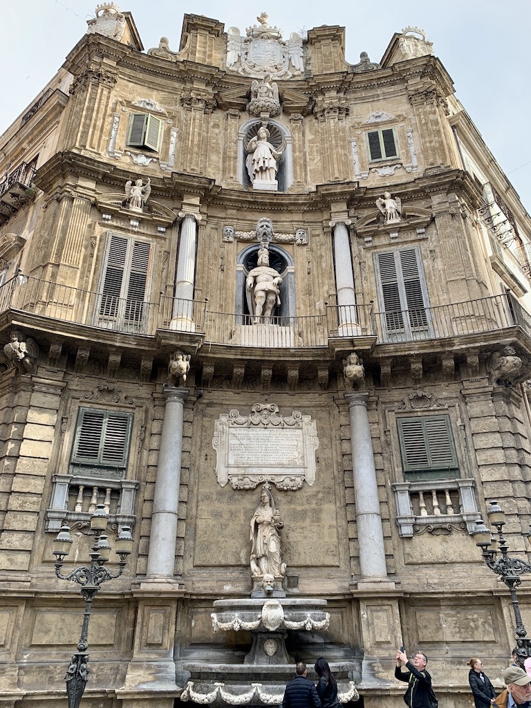 Die Brunnen und Statuen an den Palast-Fronten symbolisieren die vier Jahreszeiten Frühling (Süd-Südwest), Sommer (West-Nordwest), Herbst (Nord-Nordost) und Winter (Ost-Südost). Mittig befindet sich in jeder Fassade eine zentrale Nische. Darin stehen Statuen der spanischen Könige Karl V., Philipp II., Philipp IV. und Philipp III. Komplettiert wird das Ensemble von den Schutzheiligen Cristina, Ninfa, Oliva und Agatha. Wir steuerten diesen Platz mehrmals an während unserem zweitägigen Aufenthalt hier in Palermo und jedes Mal trat ein anderer Musiker auf. Das war wirklich eine besondere Athmosphere hier. Der eine oder andere Sänger gefiel mir so gut…also seine Stimme…, dass wir uns ein Eis hier in der angrenzenden Gelateria genehmigten und am nächsten Tag einen Drink, nur um diese Stimmung länger geniessen zu können.