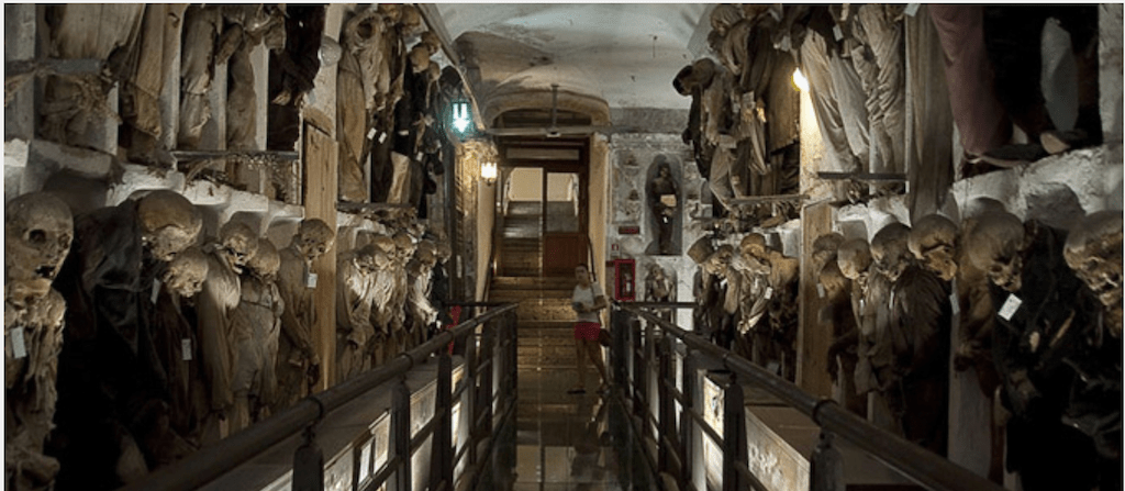 Nach einer kleinen Stärkung, machten wir uns wieder auf den Weg, auf die gegenüberliegende Seite, Richtung Palazzo dei Normanni und Porta Nuova und dann weiter zu den Catacombe dei Cappuccini. Dies ist eine Begräbnisstätte von 8000 Menschen aus der Zeit vom 16.Jh.-1920, alle bekleidet und unterteilt in Kategorien (Männer, Frauen, Kinder, Geistliche, Soldaten…)